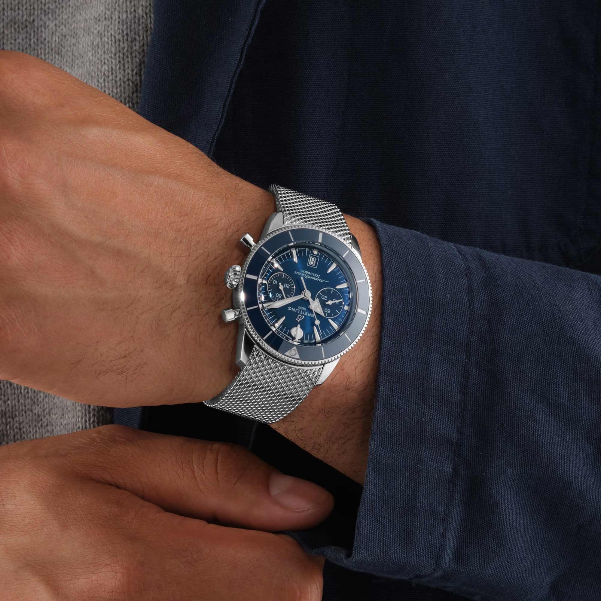 Designed for water sports enthusiasts, the Superocean heritage boasts a water resistance of up to 200 metres, making it suitable for various aquatic activities. The watch showcases a classic round stainless steel case with a silver finish, measuring 42mm in width. Its robust construction combines durability and elegance.