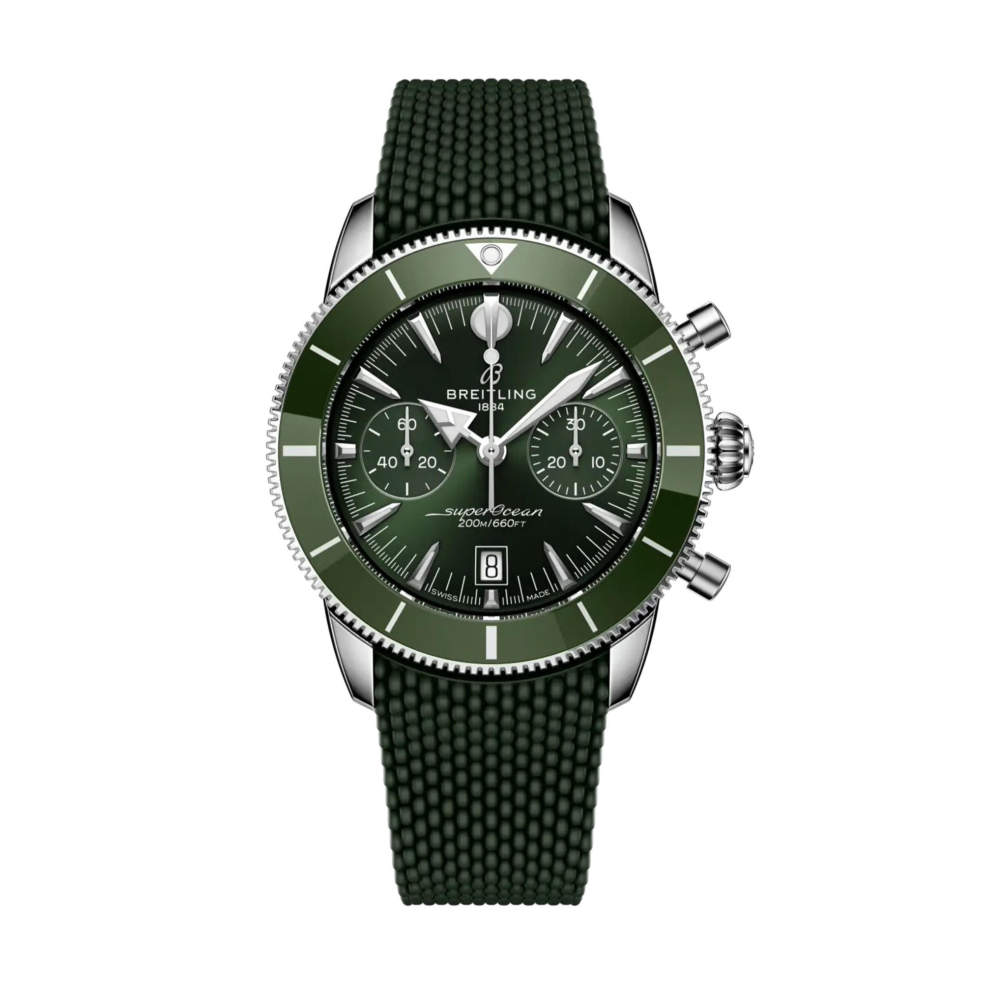 Introducing the Breitling Superocean Heritage B01 Chronograph 42mm Watch AB0156361L1S1, a perfect combination of performance and style. This timepiece features a dependable automatic movement, ensuring precision. The striking green dial adds a fresh touch and is complemented by baton markers for easy readability.