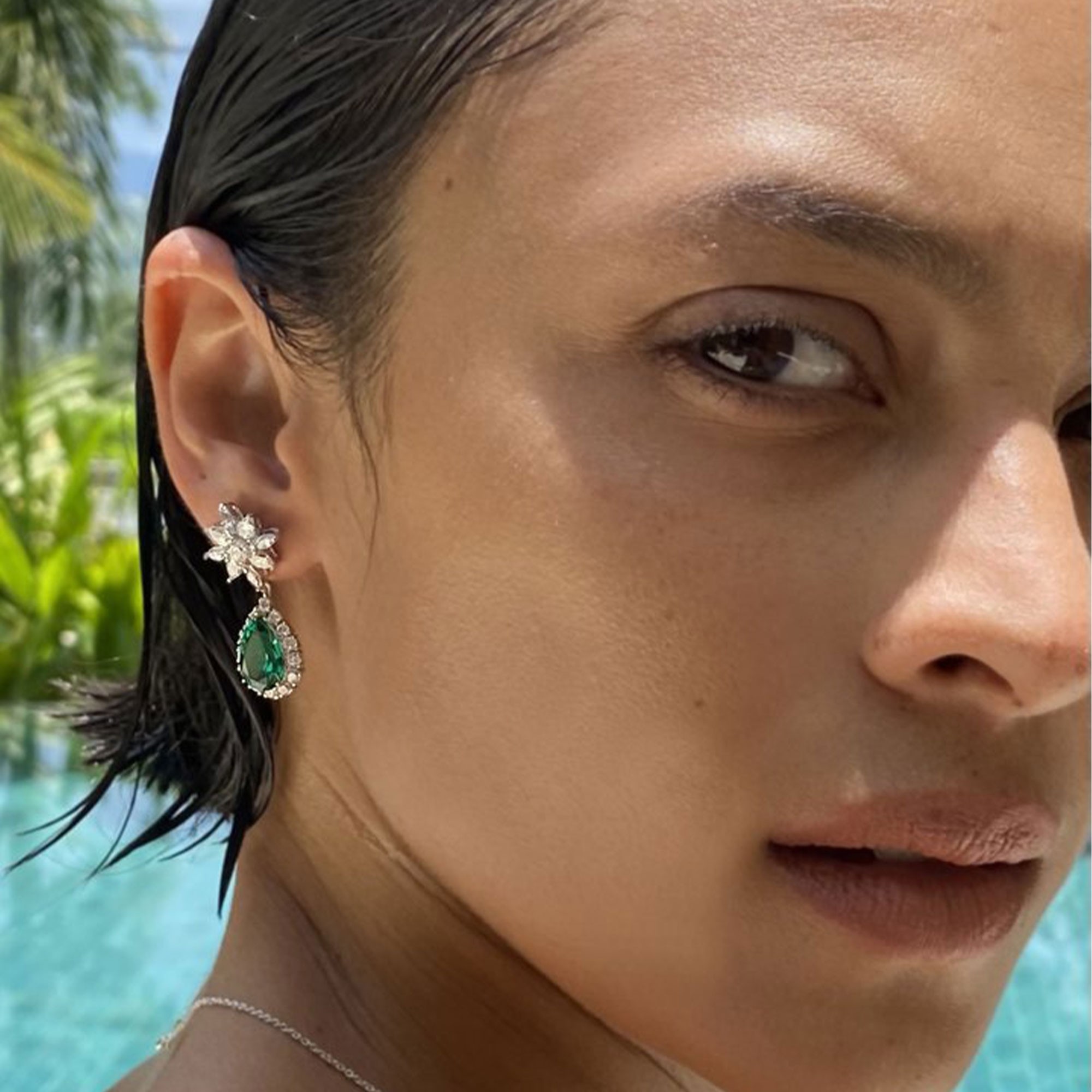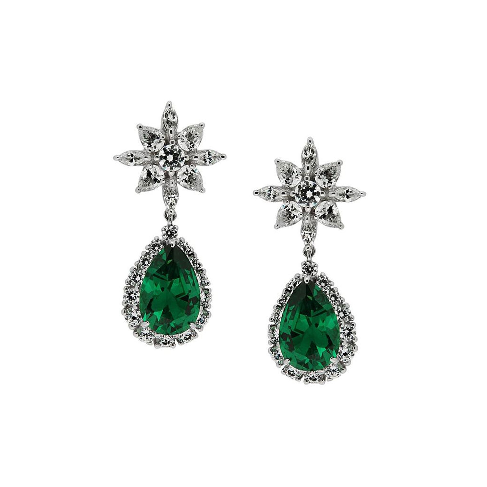 Add vintage glamour to your look with these Carat* London Camari Fancy Drop Earrings available at Chisholm Hunter. Each earring is crafted from 925 sterling silver and coated with luxurious white gold in a stunning flower shape set with cubic zirconia crystals which holds a pear cut zirconia drop. The pear cut crystal is a striking emerald green colour intensified by the white crystal halo surrounding it. This piece will add drama to any outfit.