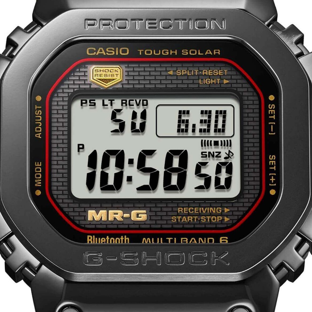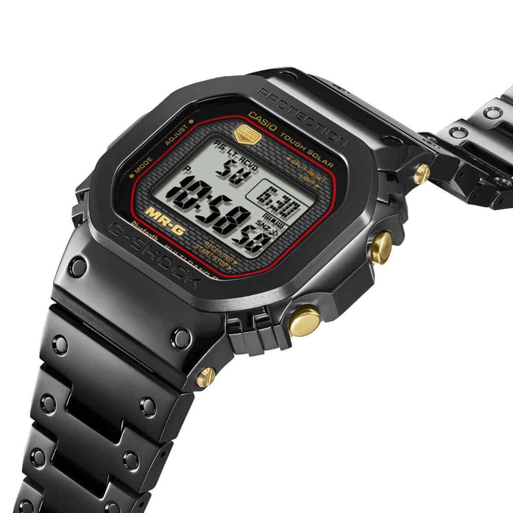 Please welcome a new addition to the MR-G series, the pinnacle of G-SHOCK shock-resistant watches, the MRG-B5000 collection. These are the first MR-G timepieces to feature the iconic design of the very first G-SHOCK the DW-5000C, and they bring a brilliant shine and dignified distinction to the form by employing cutting-edge metallic finishes and master polishing craftsmanship. In order to apply sophisticated polished finishes to even the tiniest corners of the complex bezel form, which is made of 25 different components, CASIO developed the new Multi-Guard Structure. COBARION, which has a hardness about four times that of pure titanium and a brilliant gleam comparable to platinum, is used for the top surface of the bezel. The band is made with DAT55G, a titanium alloy that is both about three times harder than pure titanium and highly workable, making it scratch-resistant and ensuring a long-lasting, beautiful mirror finish. There are also separate pins embedded in round holes in each metal link to allow detailed polishing for an equally beautiful finish on the band. When it comes to function, the MRG-B5000 features radio-controlled calibration and Bluetooth Smartphone Link connectivity The MRG-B5000B-1DR is finished in a subtle black tone and it comes equipped with a solar charging system and high-brightness LED light, making it perfect for all occasions.