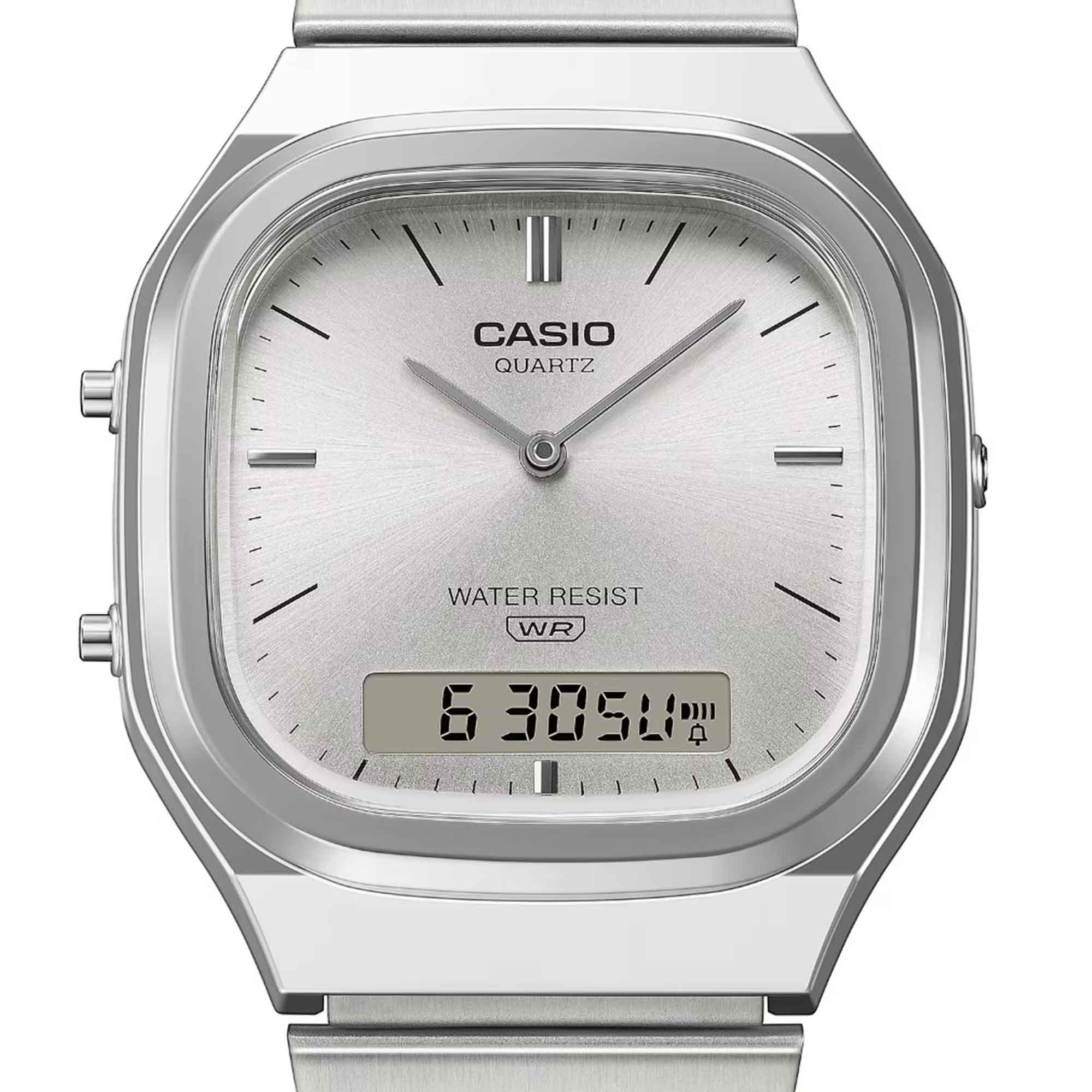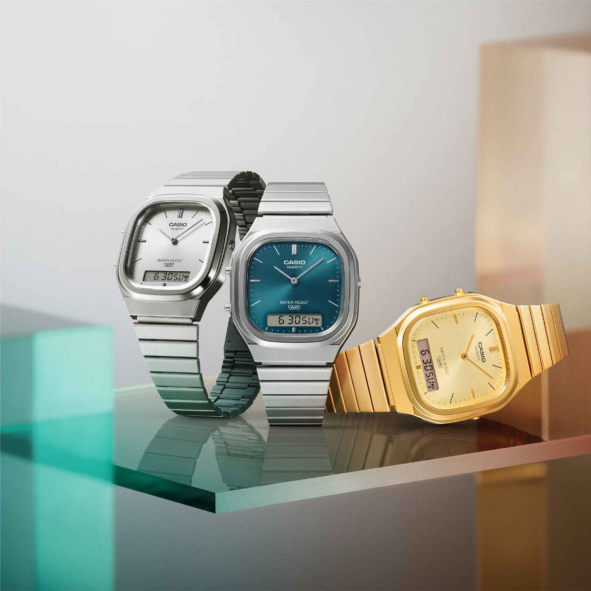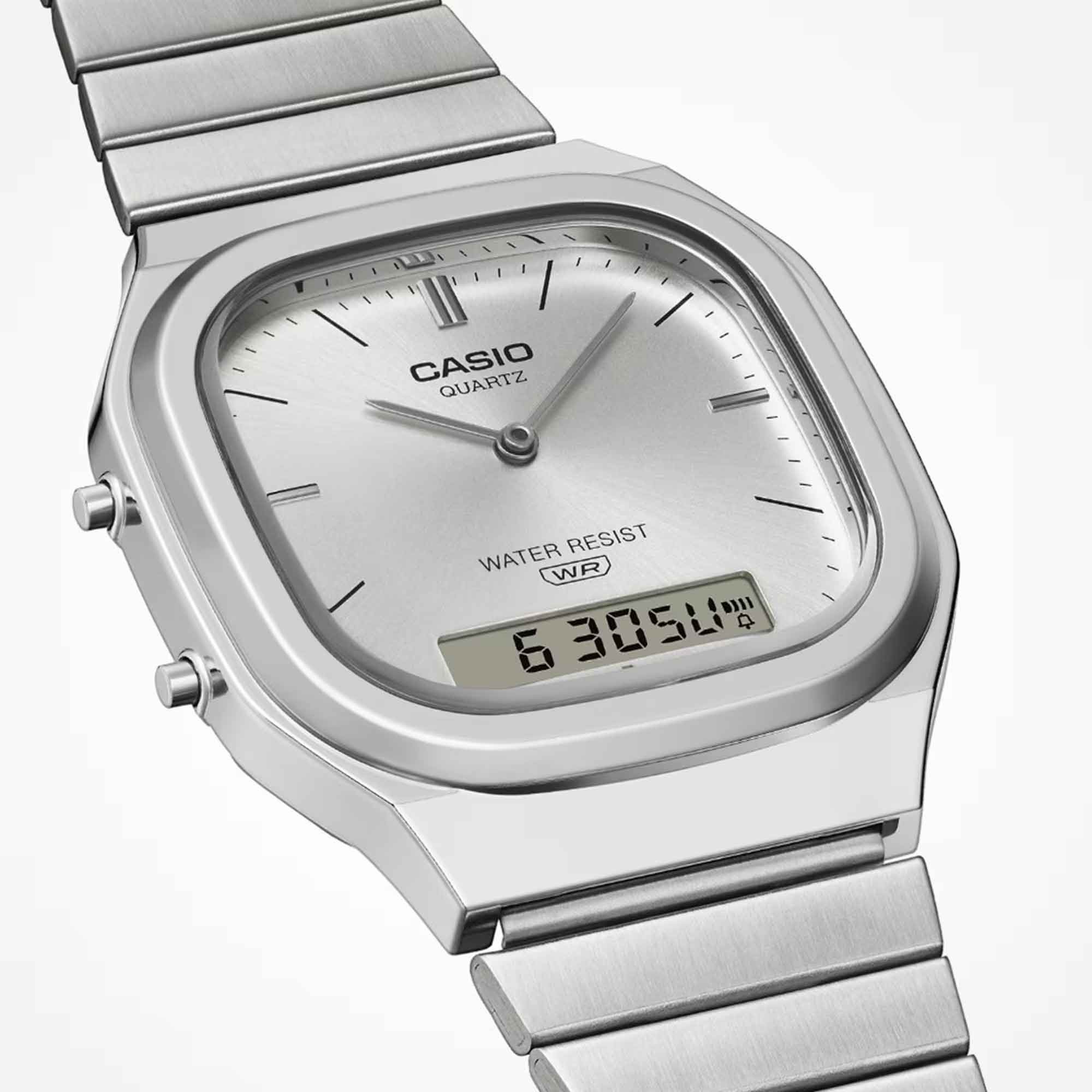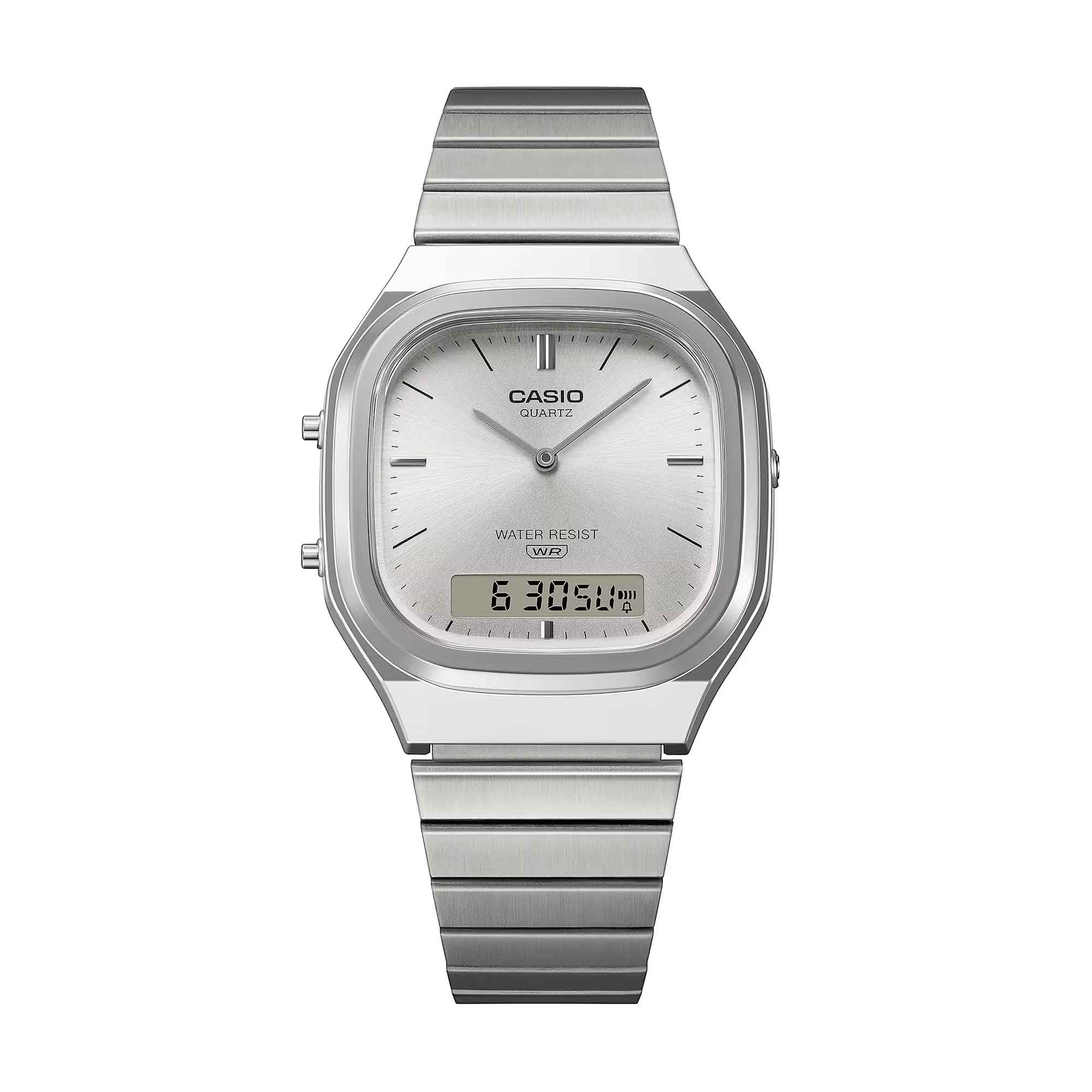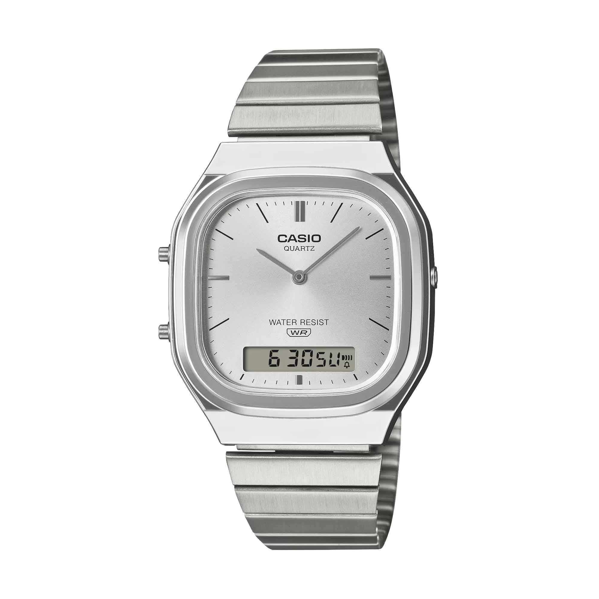 Introducing the latest addition to the AQ series - the AQ-240E, where retro character meets modern design in a truly timeless piece. This analogue-digital has a slightly rectangular case, with softly rounded edges and sleek metallic lines for a polished, sophisticated finish.