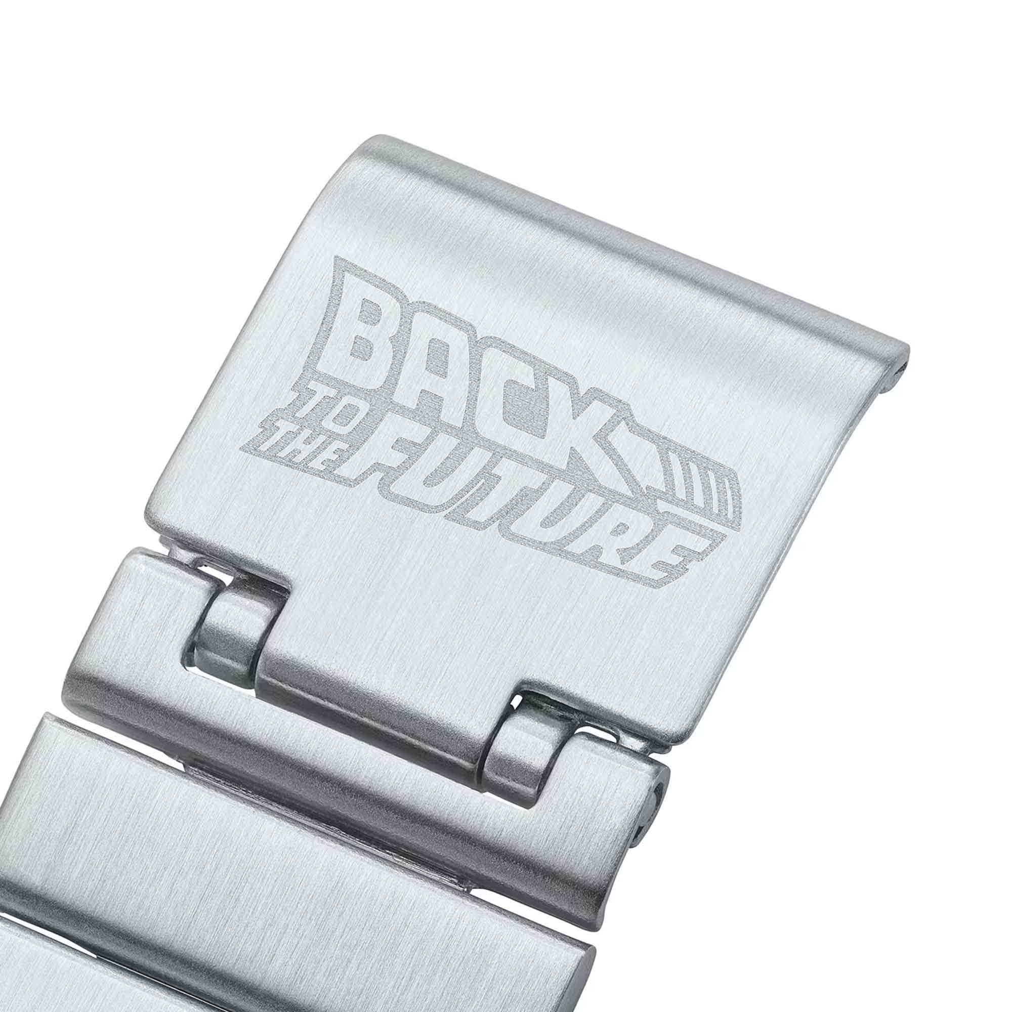 The flux capacitor, the iconic piece of fictional technology that transforms the DeLorean into a time machine and enables travel through time, is engraved on the case back. The CA-500WEBF-1AER is full of loving details, such as the Back to the Future logo on the strap clasp. The silver case and strap ensure an elegant look.The watch comes in a special packaging designed to resemble an old videotape that captures the world of the film – a very special collector's item for all CASIO VINTAGE and science fiction fans.