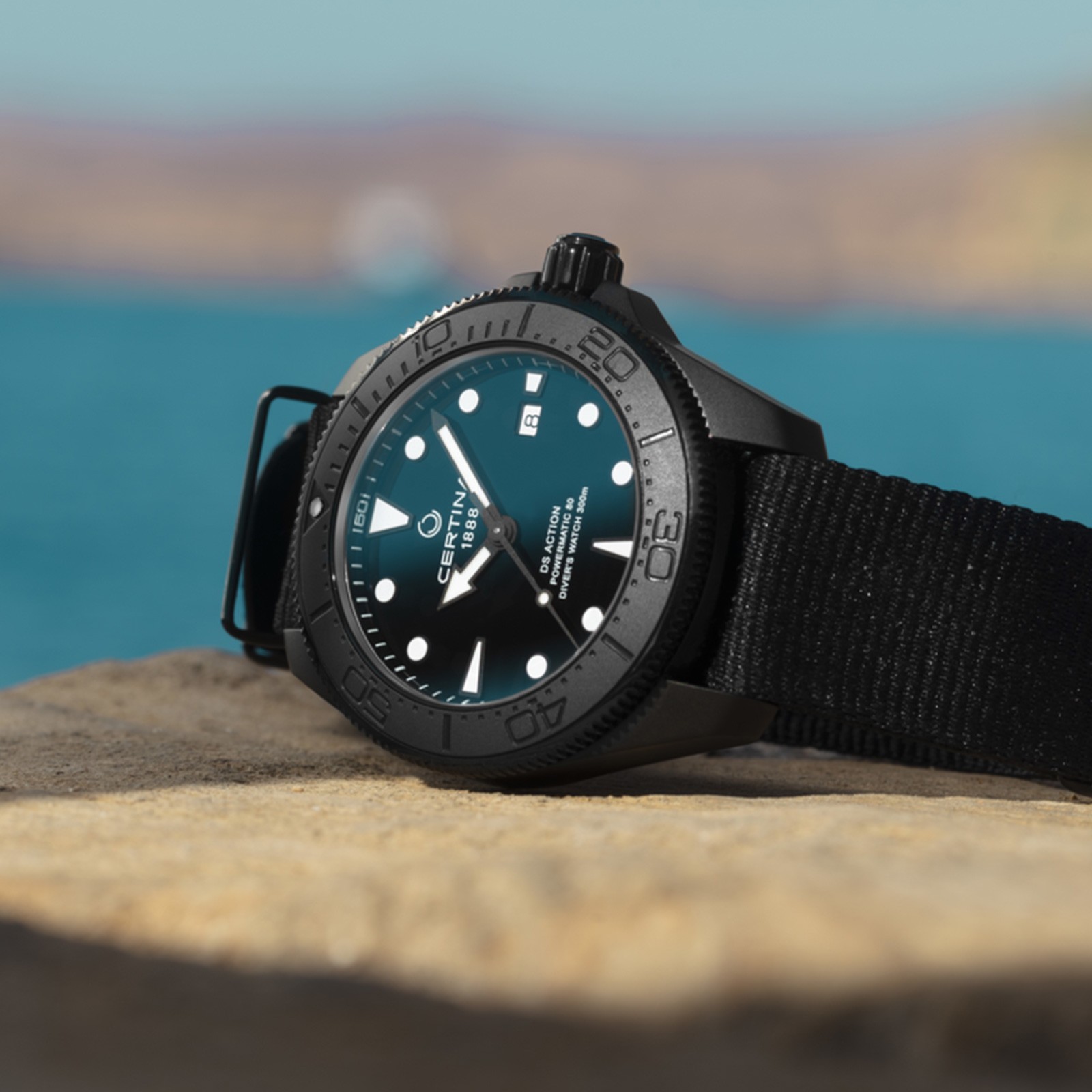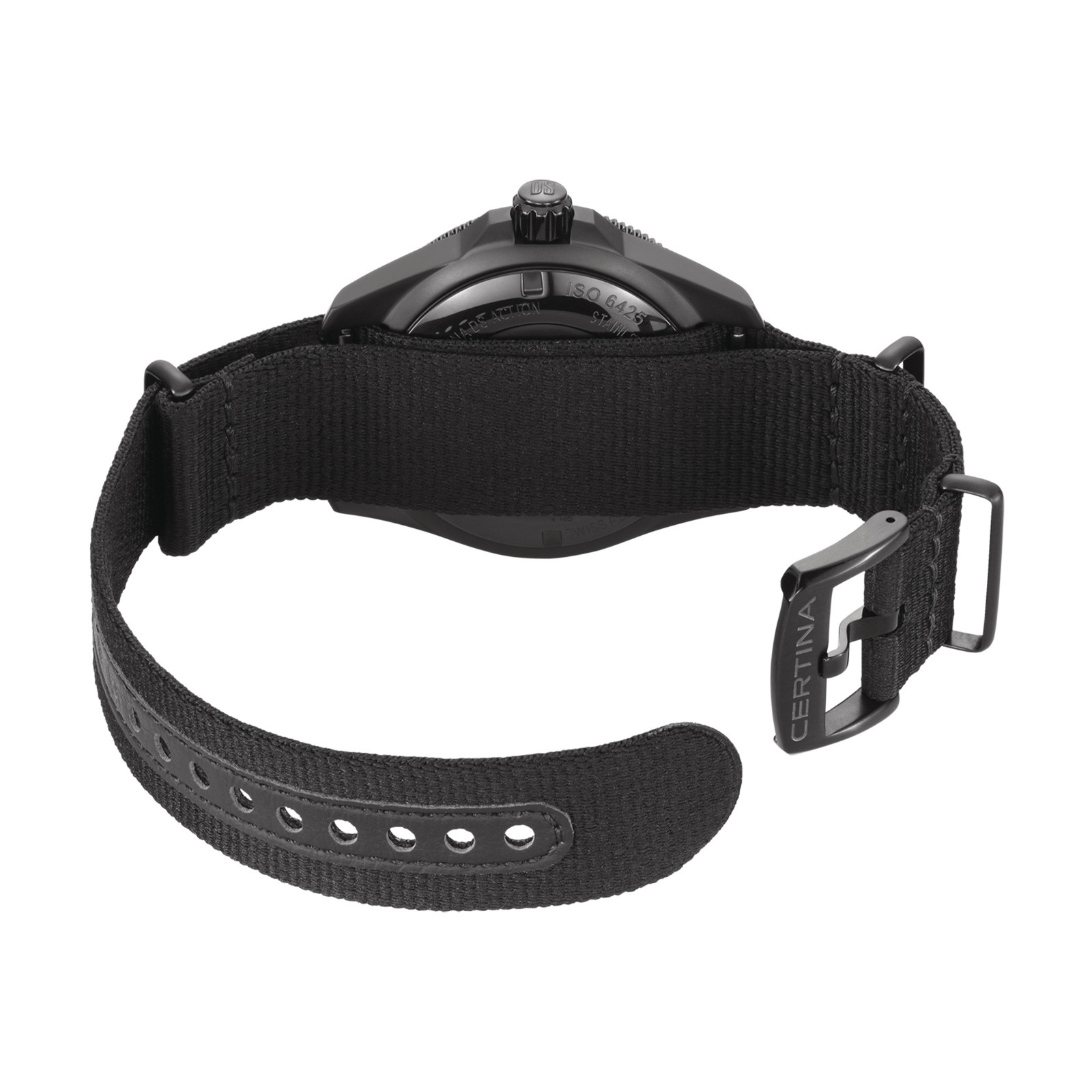 The Certina Action Diver Automatic 43mm Mens Watch C032.607.38.051.00 is a robust and reliable timepiece designed for adventurers and water enthusiasts. With its striking design and impressive features, this watch is built to withstand the rigors of underwater exploration while exuding a sporty and masculine aesthetic. The watch showcases a durable stainless steel case with a diameter of 43mm, making a bold statement on the wrist without compromising comfort. The black unidirectional rotating bezel, highlighted with a silver-tone minute scale, adds a touch of functionality and adds to its rugged charm. Designed for underwater adventures, the Certina Action Diver Automatic boasts an exceptional water resistance rating of up to 300 meters (1000 feet). It is crafted to withstand the pressures of recreational diving and offers a reliable timekeeping companion in aquatic environments. The screw-down crown ensures water resistance and further enhances the watch's durability. Shop Certina watches at Chisholm Hunter today.