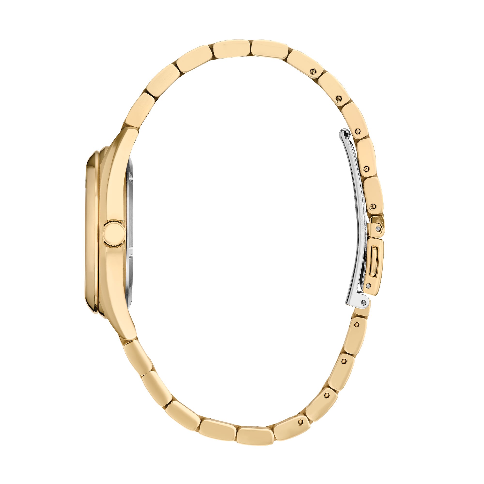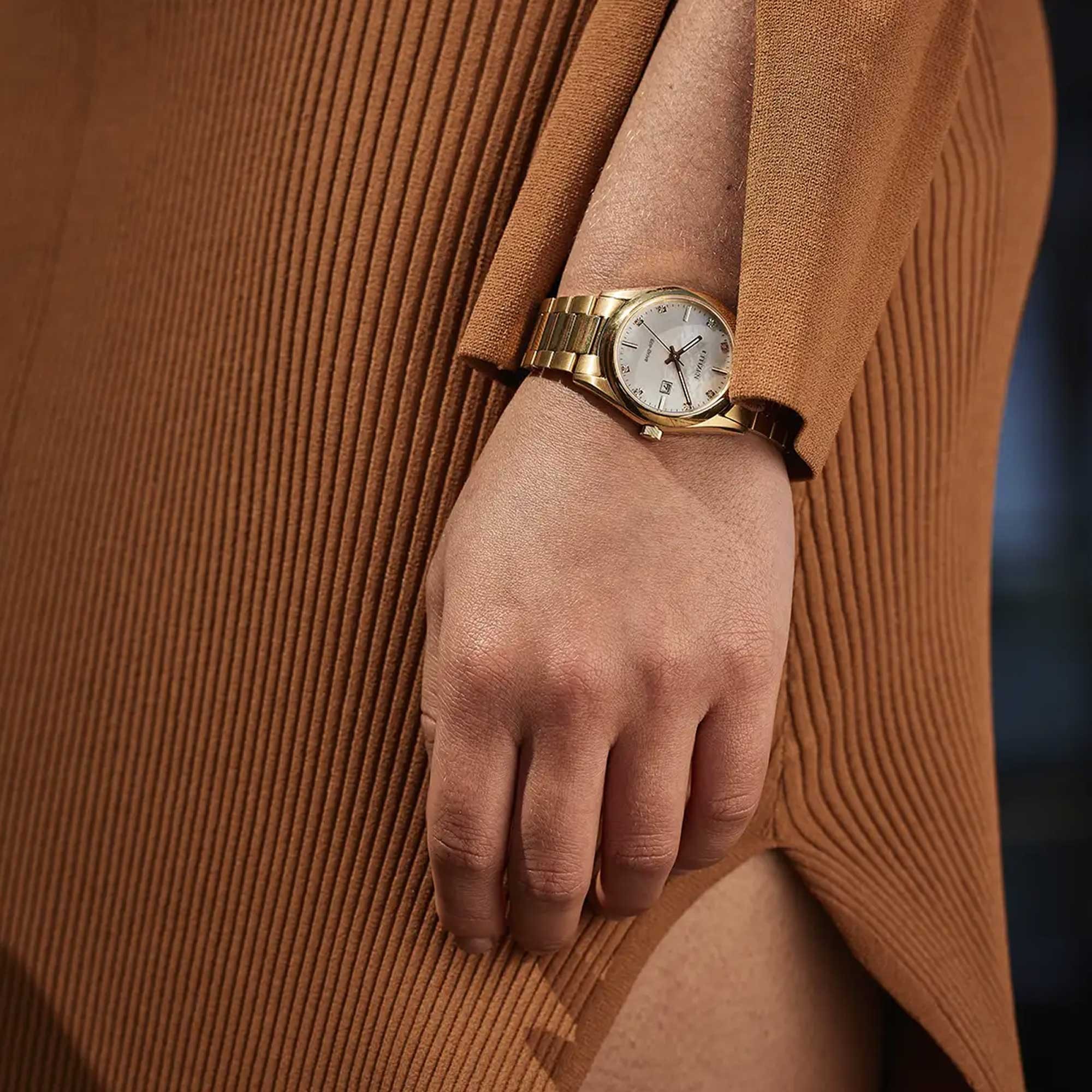 Designed for the woman who navigates through life with grace, this watch boasts 100 metres water resistance, making it your faithful companion whether you’re attending a glamorous event or embracing life’s everyday adventures. The round stainless steel case, bathed in a luxurious gold colour, encapsulates the watch's eternal elegance, perfectly complemented by the metal bracelet with a secure folding clasp, ensuring comfort alongside opulence.