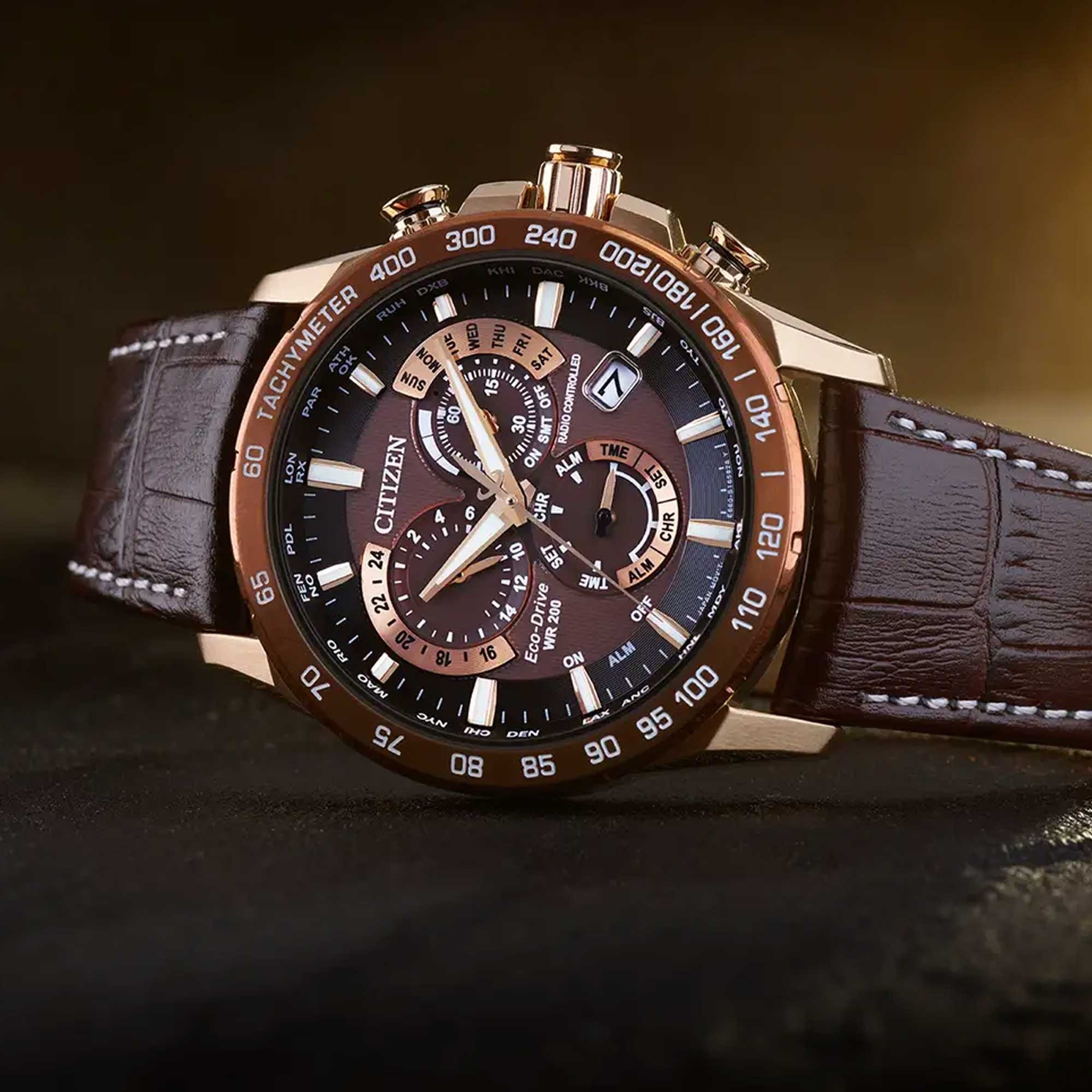 With a passion for speed and accuracy the re-imagined Citizen Perpetual Chrono A-T features radio-controlled atomic clock synchronisation for superior accuracy in 24 time zones.