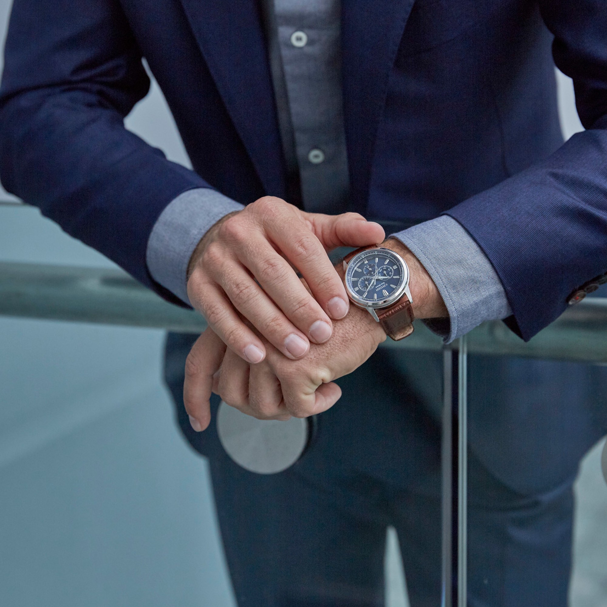The dial, in a stunning shade of blue, provides an eye-catching contrast against the sleek silver of the stainless steel case, making it a statement piece that's versatile enough to grace any occasion. Its round 44mm case, with a refined depth, sits comfortably on the wrist, asserting a presence that's both impressive and understated.