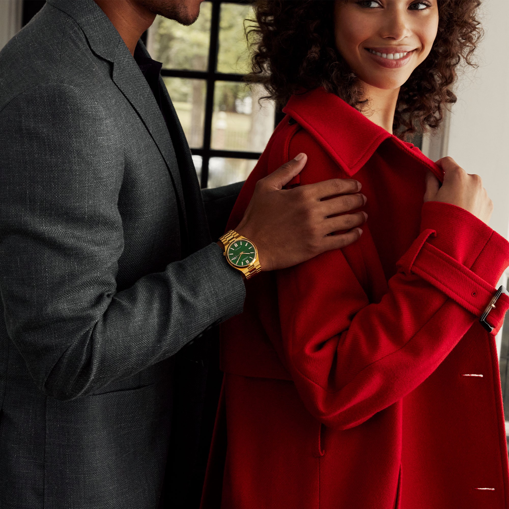The watch boasts a striking green dial, set against dots and batons markers, encapsulated by a sapphire crystal glass that not only adds a touch of elegance but also ensures durability against scratches and impacts. The round gold stainless steel case, with a width of 40mm, exudes sophistication and offers a sturdy protection for the intricate workings within.