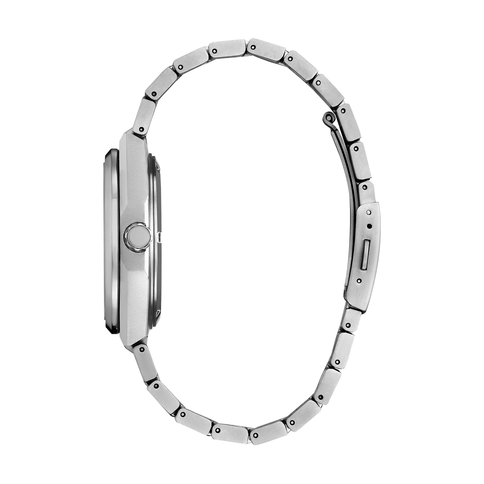 Pairing classic proportions and innovative technology with a distinctly modern style, we present our new Zenshin Automatic series. Made with our proprietary material, Super Titaniumâ„¢, which is five times harder and 40% lighter than stainless steel and is scratch- and rust-resistant, this sporty timepiece features a silver-tone Super Titaniumâ„¢ case that is elevated with finely brushed and polished finishing while being secured to the wrist with an integrated matching bracelet. On the dial the sub second hand sits off centre and the textured white dial is accented with silver-tone details and luminous hands and markers. Water resistant to 100 metres.