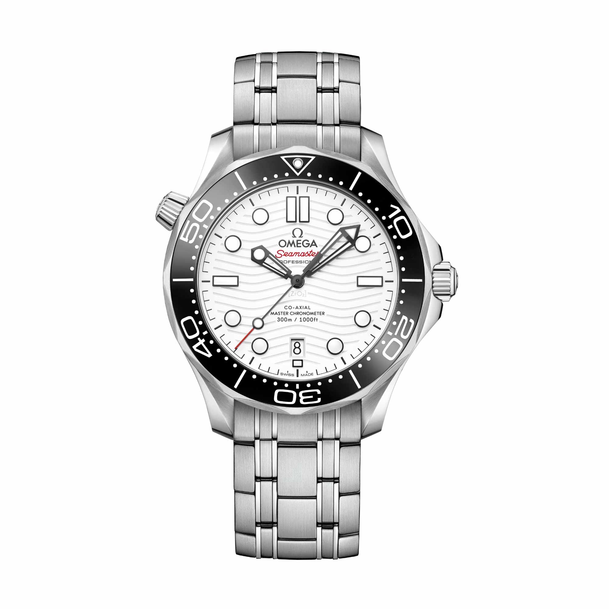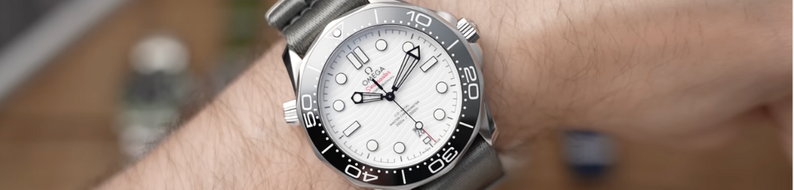 In contrast to the Seamaster 300, the Diver 300M has a date display and a notably more modern design. The wavy edge on the bezel is particularly striking, and the dial, which comes in black, white, gray, blue, or – as of 2022 – olive green, features a distinctive wave pattern on most editions. The Diver 300M also brandishes sword-shaped skeleton hands.