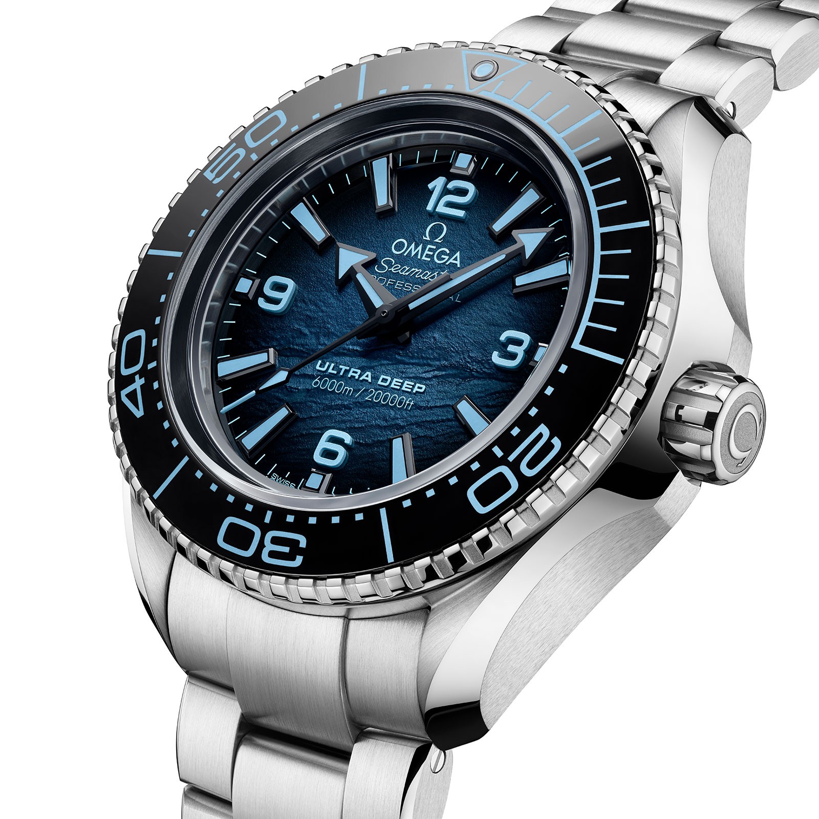 The Omega Seamaster Ultra Deep 6000m, the pinnacle of the collection, stands out with its remarkable textured dark blue dial. The dial showcases intricate texture patterns that evoke the depths of the ocean. However, the true marvel reveals itself when UV light is shined upon it, unveiling a secret message. The depth of the blue on the dial intensifies as the watch can withstand greater water pressure, creating a mesmerising visual representation of the watch's capabilities.