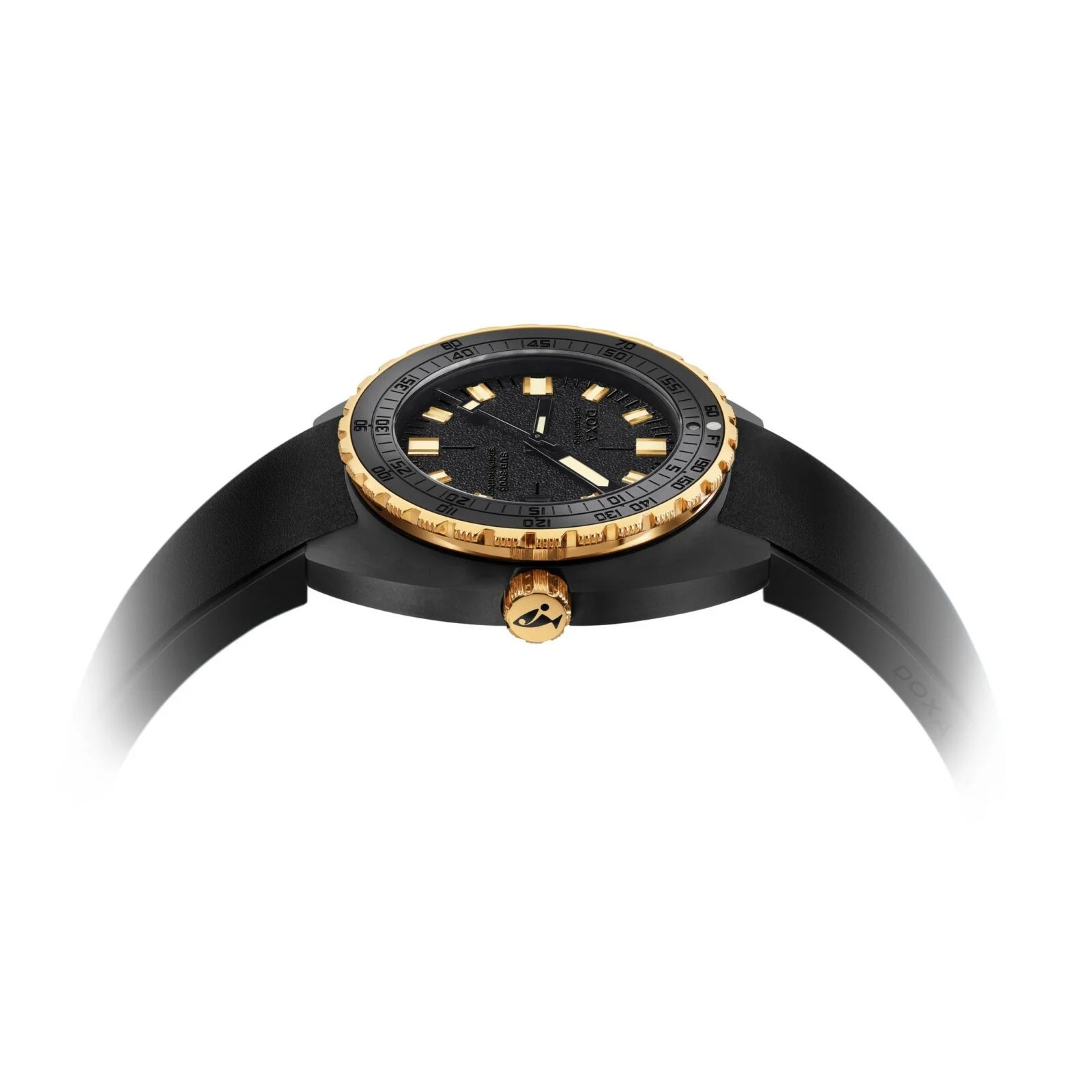 The result is extravagance with a sense of proportion and a choice of materials that connect the watch to our time. A way of juxtaposing elements that seems to have been waiting beneath the surface all along: the black ceramic case, the matte grained dial with black-on-black markings… and the dazzling contrast with the mission-critical information provided by the hands and indexes, and the functional components of the bezel and crown in 18K 3N gold. The DOXA SUB 300β Sharkhunter comes on a black FKM rubber strap for a particularly comfortable fit.