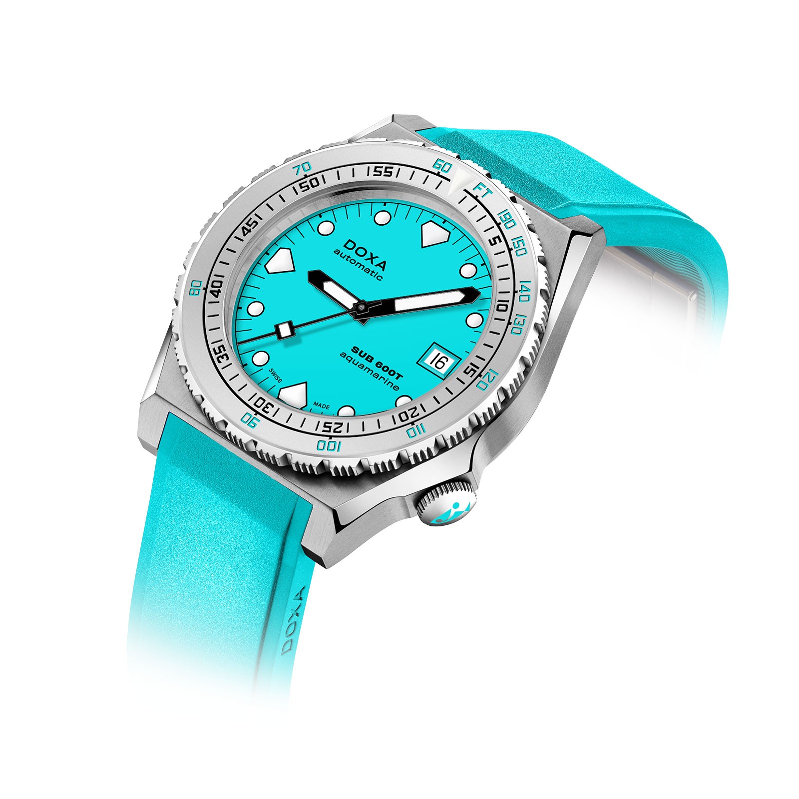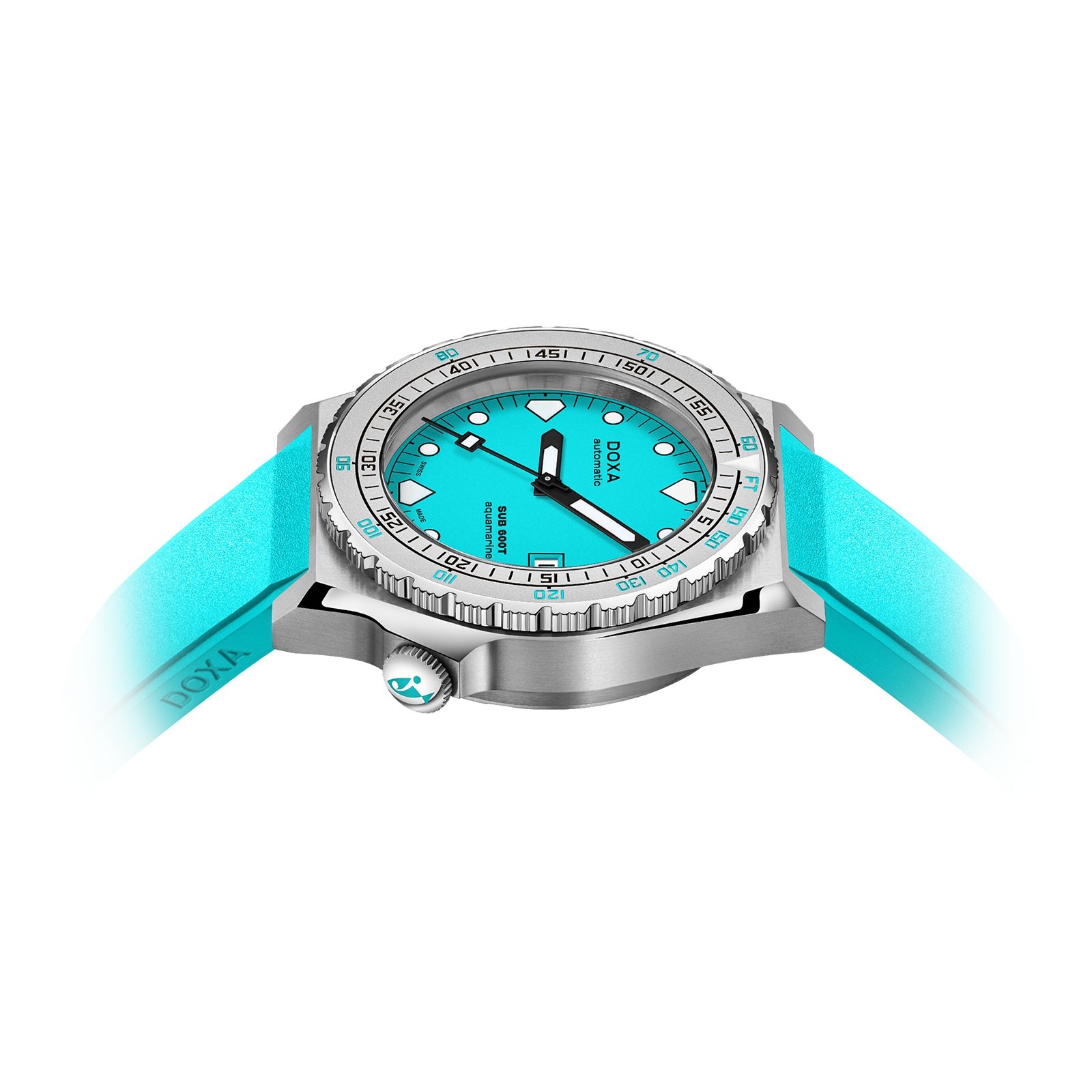 Defining DOXA in the 80s and becoming an icon of its era, discover the DOXA SUB 600T Aquamarine 862.10.241.25 at Chisholm Hunter today. With the 3 hands and date window remaining true as ever to the aesthetic of the original SUB 600T, this men's timepiece has been updated for the modern wearer. Reliable, desirable and an eminently wearable diver's watch for today, the 40mm 316L stainless steel case diameter remains unchanged. With an aquamarine dial protected by sapphire crystal, this model is pressure-resistant to 600 metres. Complete with a unidirectional rotating bezel to calculate a safe ascent without decompression stops, the bezel, with dual indication of the dive time (minutes) and depth (feet), comes in sandblasted steel. All dive-related indications are coated with luminescent Super-LumiNova®, including the distinctive 'shark tooth' markers at 3, 6, 9 and 12 o'clock, for optimal readability in low light conditions. Presented on a tone-on-tone aquamarine rubber strap to match the aquamarine dial colour, the FKM rubber strap features a new clasp: it looks like a pin buckle, but it is actually a folding buckle for quick, convenient and comfortable adjustment to the owner's wrist.