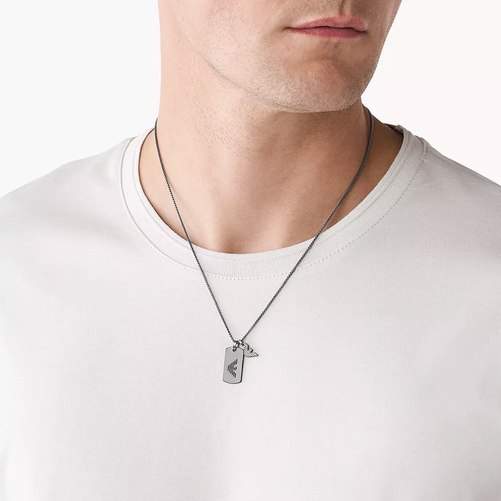This stylish and masculine Emporio Armani Sentimental Mens Necklace EGS2811060 is available to shop today at Chisholm Hunter. Crafted from durable stainless steel, this dog tag necklace features a grey brushed finish with the iconic eagle logo engraved in white and a small eagle motif charm attached to a 52.5cm.