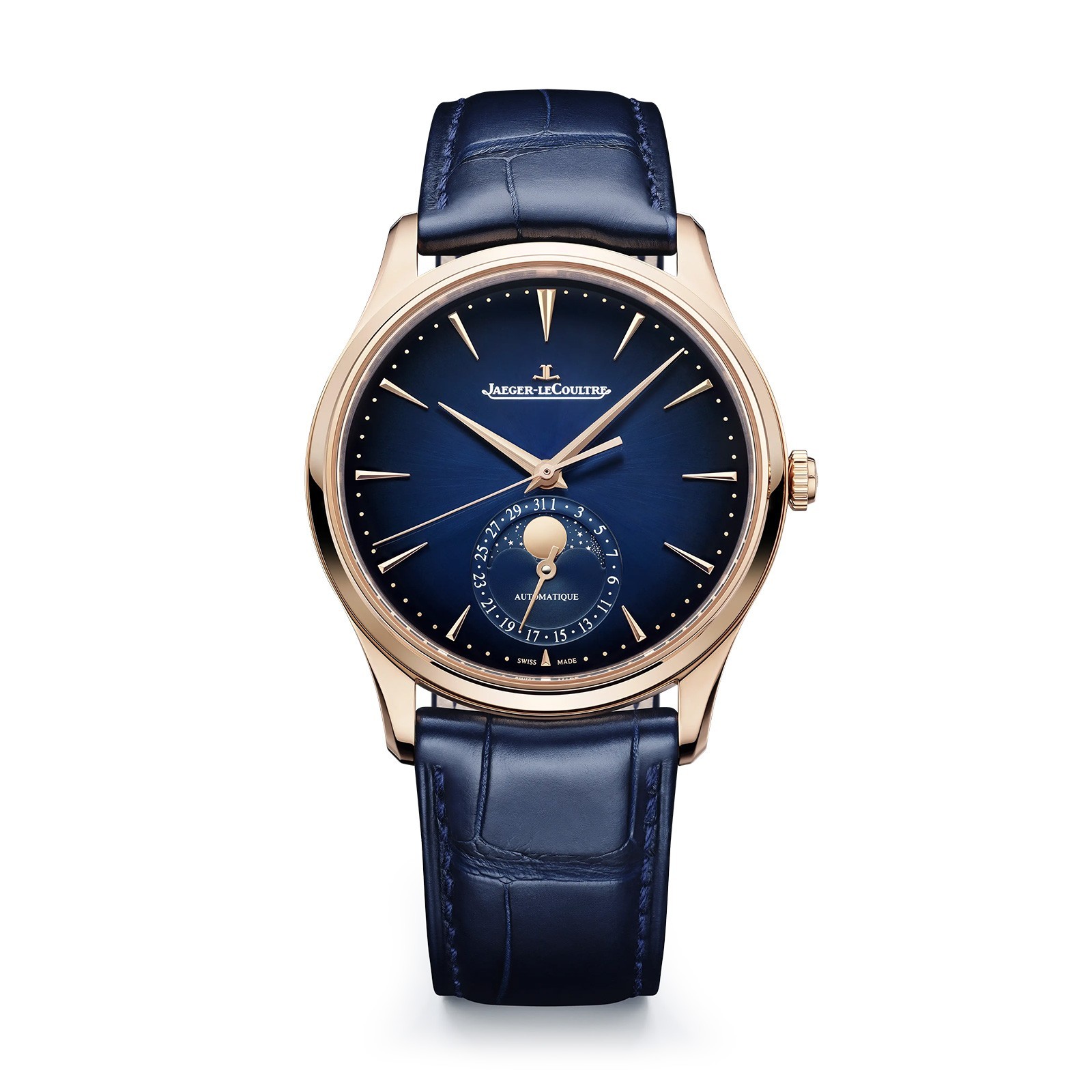 This Ex-Display Jaeger-LeCoultre Master Ultra Thin Moon Mens Watch Q1362580 boasts a sunray dial in a deep, intense, slightly smoky blue.