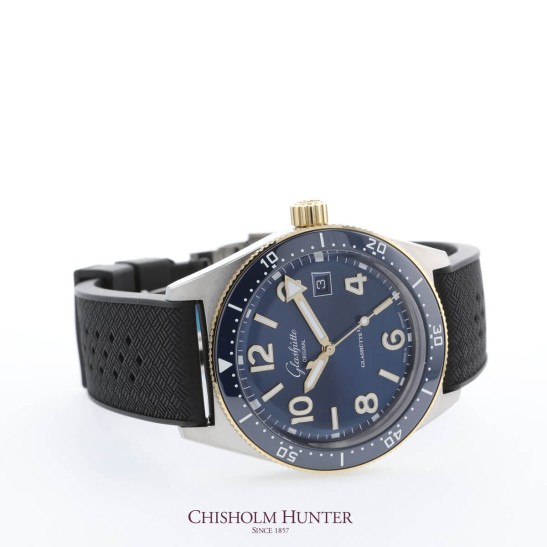 An exclusive for Chisholm Hunter. A sporty watch with a story behind it; the all new Glashütte Original Sea Q 1-39-11-10-90-33 bi-colour model takes hues from the brands very first diver's watch from 1969, the the Spezimatic Typ RP TS 200. This new model has been adapted for the modern and active wearer. Having passed both German and international standards of quality, this sporty timepieces has passes the rigorous DIN 8306 and ISO 6425 tests that are required for certification as a professional diver’s watch. Be it on land or in the water, this Sea Q model is reliable, ready to accompany on all lives adventures. A cool stainless steel case combines with a rotating yellow gold bezel, while a deep blue dial boasts contrasting golden numerals and Super-LumiNova hands which add a touch of warmth.