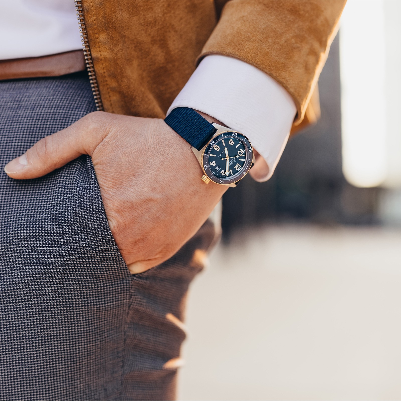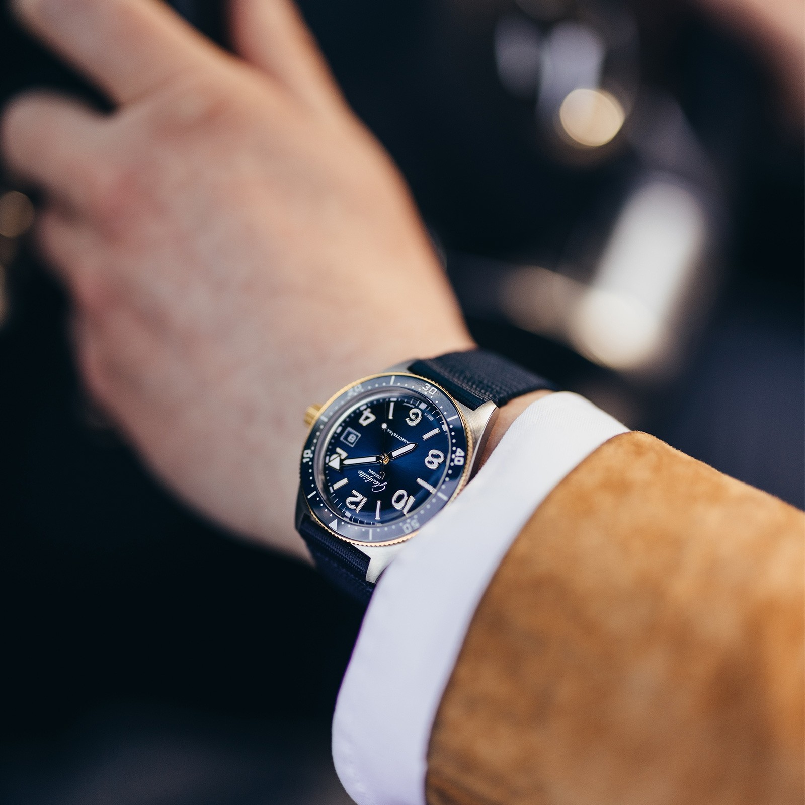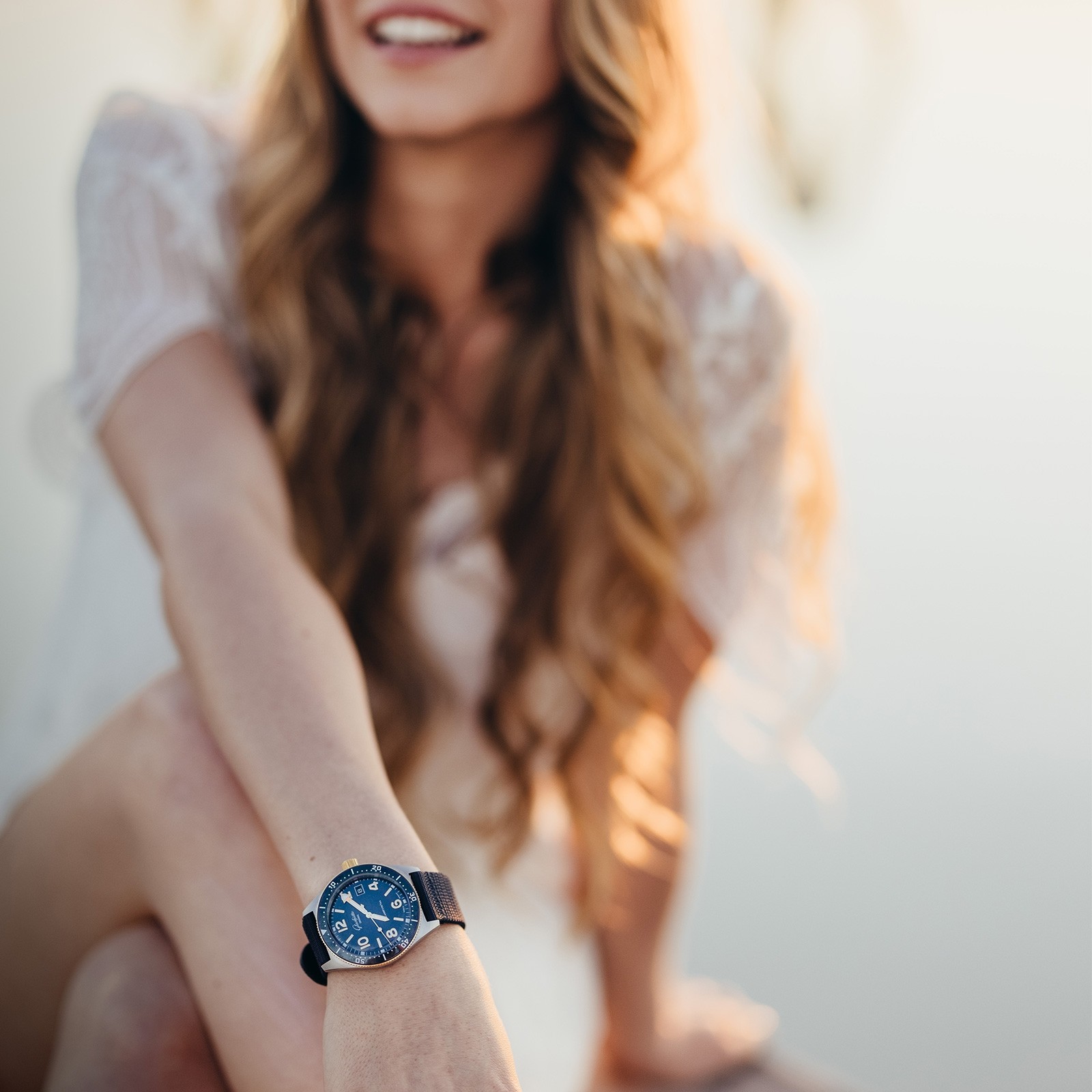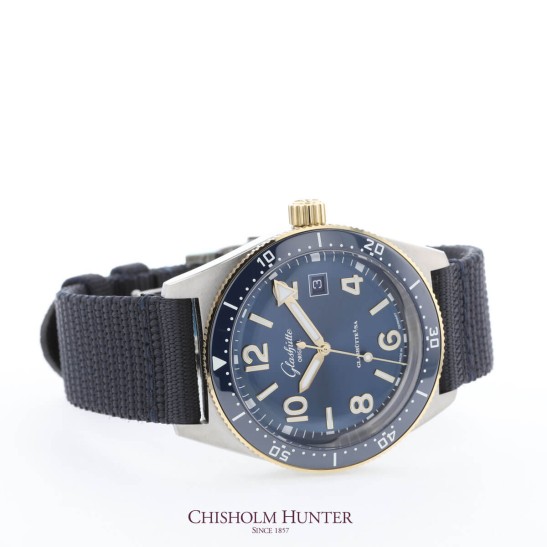 An exclusive for Chisholm Hunter. A sporty watch with a story behind it; the all new Glashütte Original Sea Q 1-39-11-10-90-34 bi-colour model takes hues from the brands very first diver's watch from 1969, the the Spezimatic Typ RP TS 200. This new model has been adapted for the modern and active wearer. Having passed both German and international standards of quality, this sporty timepieces has passes the rigorous DIN 8306 and ISO 6425 tests that are required for certification as a professional diver’s watch. Be it on land or in the water, this Sea Q model is reliable, ready to accompany on all lives adventures. A cool stainless steel case combines with a rotating yellow gold bezel, while a deep blue dial boasts contrasting golden numerals and Super-LumiNova hands which add a touch of warmth.