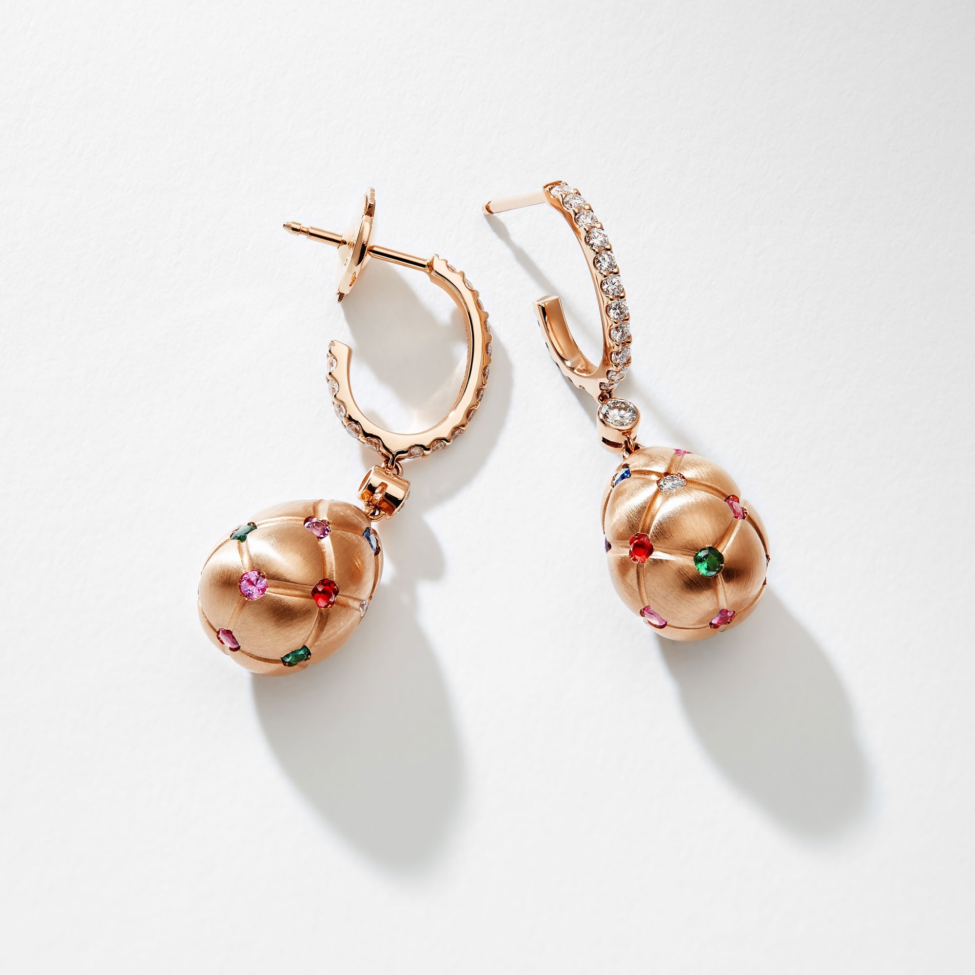 The Fabergé Heritage Forever Quilted Egg Drop Earrings with Mixed Gemstones 378EA 1250 / 58 are a radiant creation crafted in 18k brushed rose gold. Round brilliant-cut diamonds and coloured gemstones shine against the matte finish of the gold — a testament to the Maison’s unique artistry and savoir-faire.