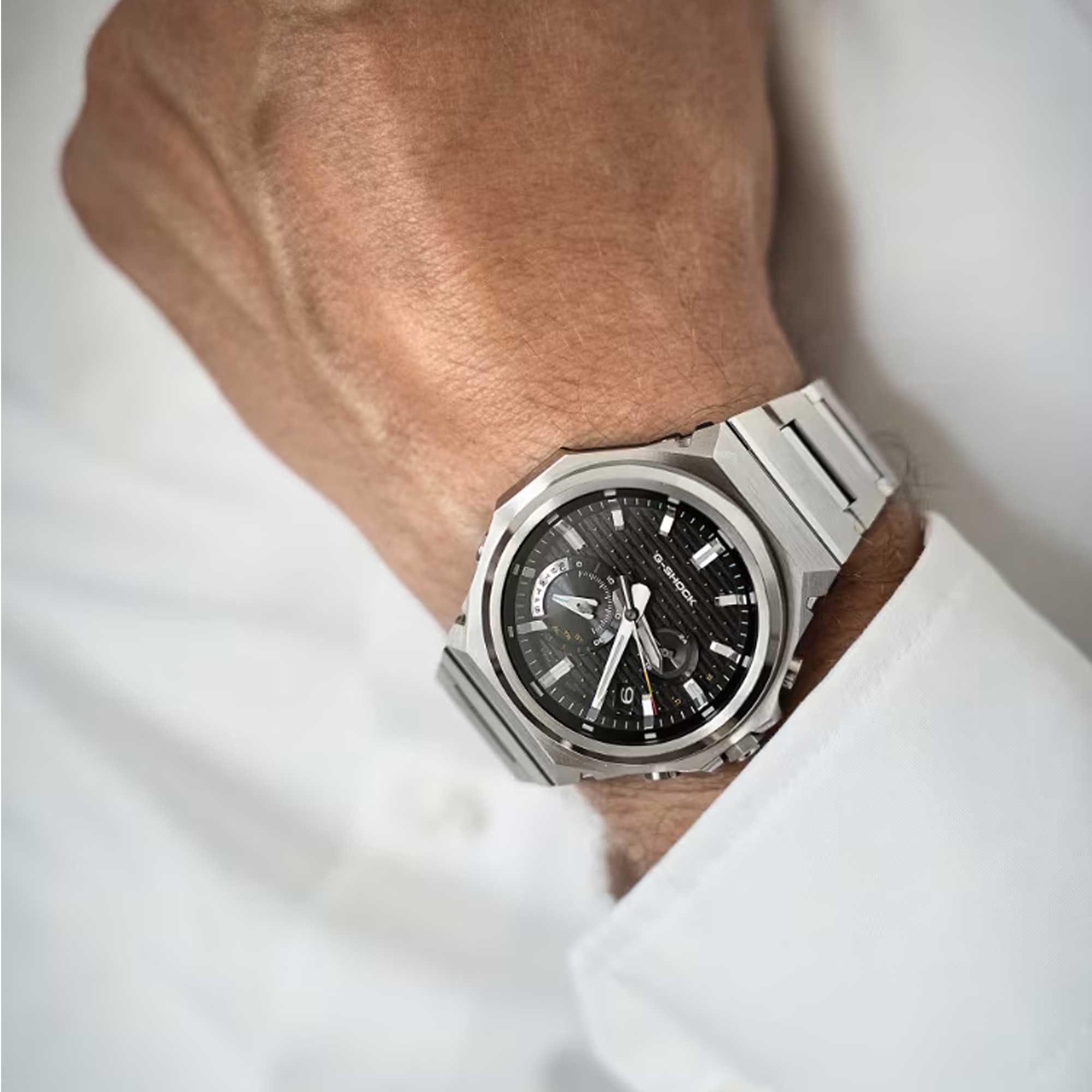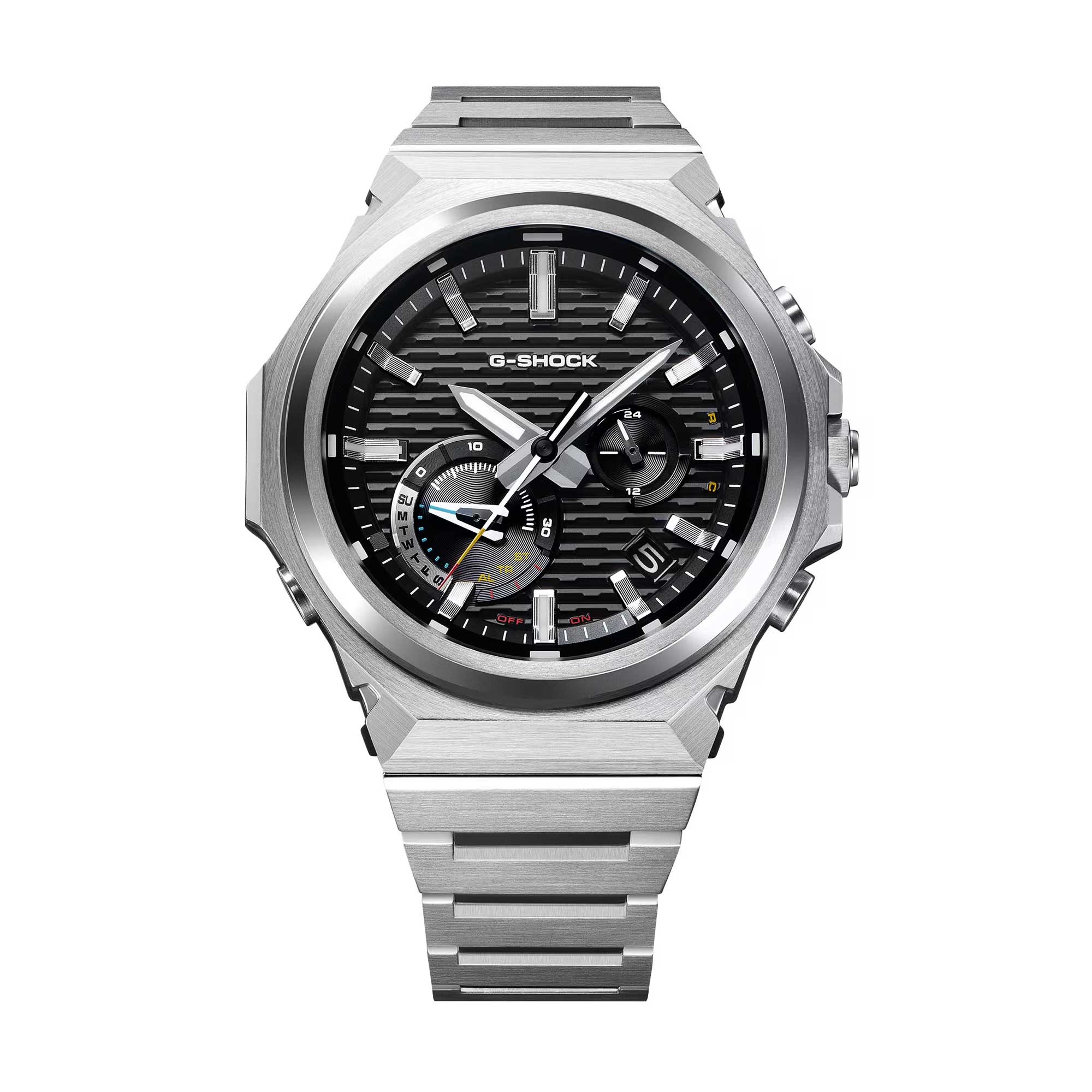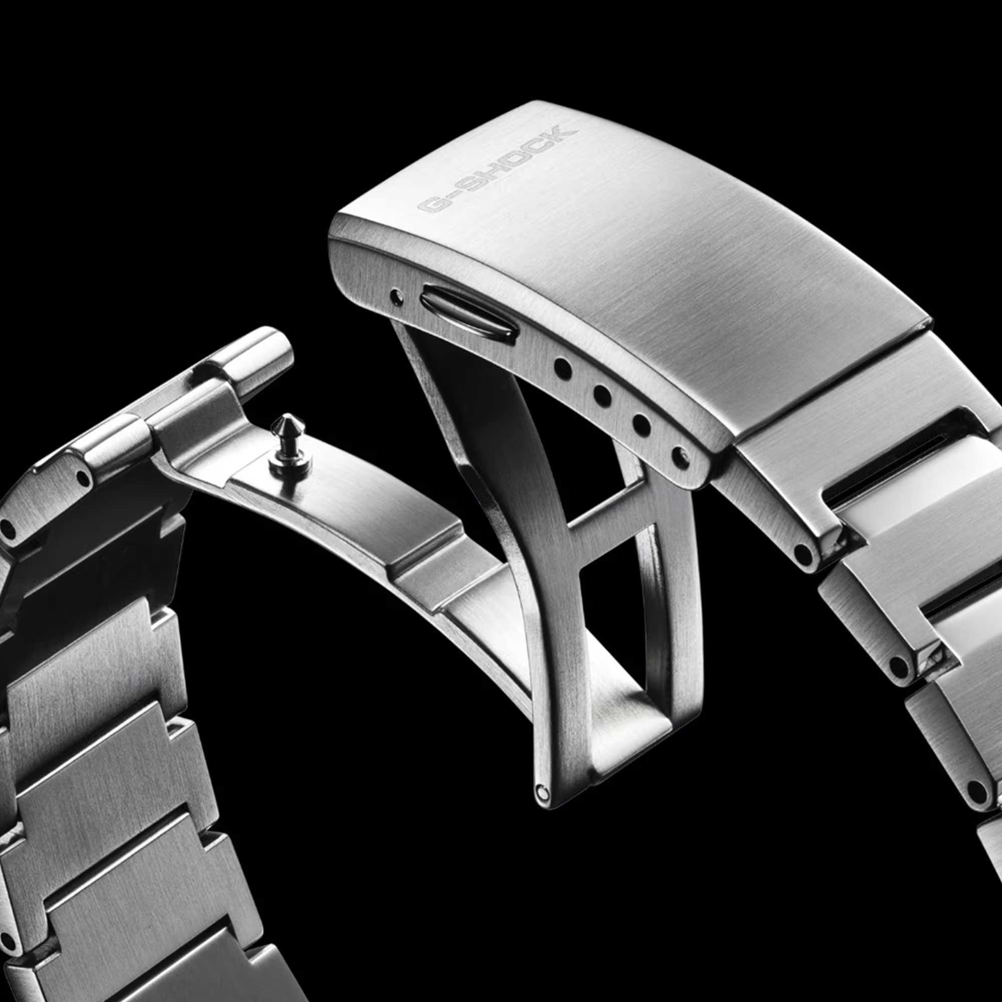 The G-SHOCK GST-B1000 Series G-STEEL Mens Watch GST-B1000D-1A reinterprets the G-SHOCK legacy with a sharper, minimalist take on functional beauty. The bezel forgoes the logo for a clean, contemporary profile, finished with vertical and circular hairline brushing and mirror polishing that catch the light from every angle, giving depth and dimension. Its solid stainless-steel band and tri-fold clasp echo the same precision, with a nod to its heritage in the familiar bezel silhouette and signature brick pattern. It pairs a black dial and baton markers with an assured G-STEEL presence.