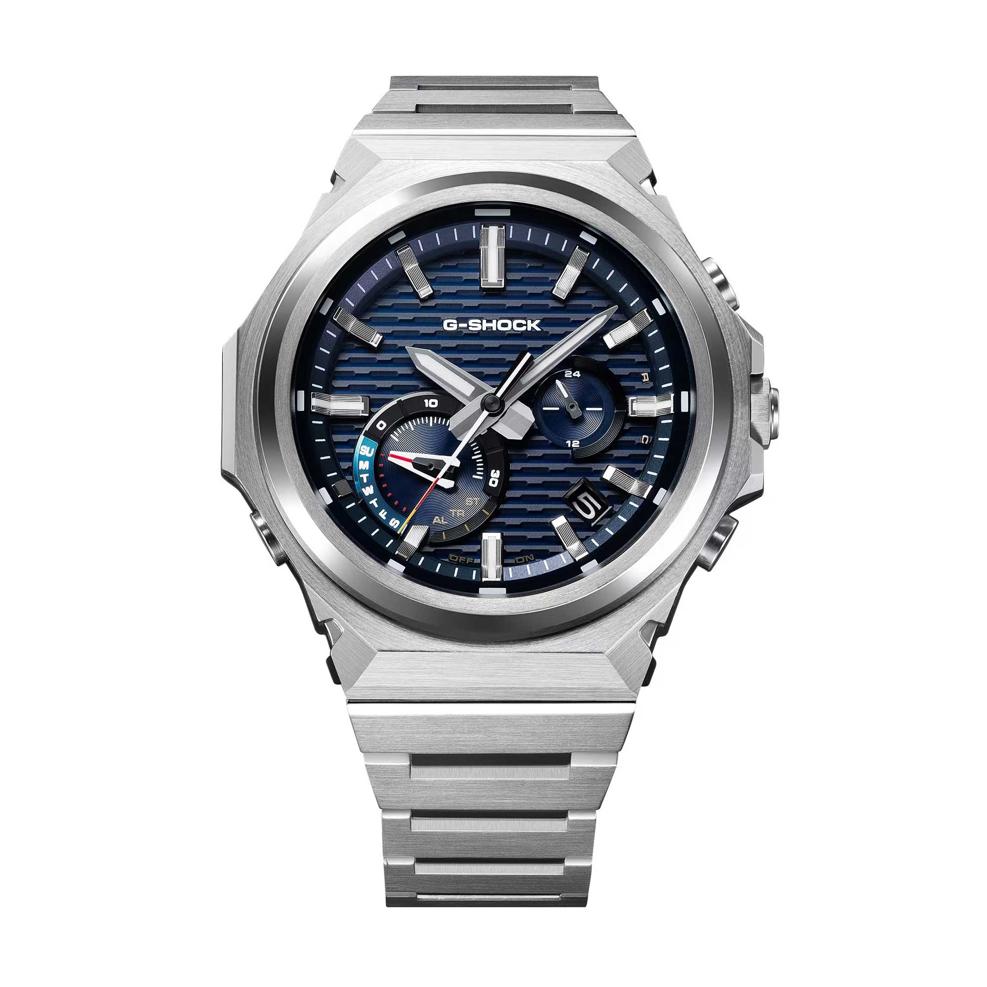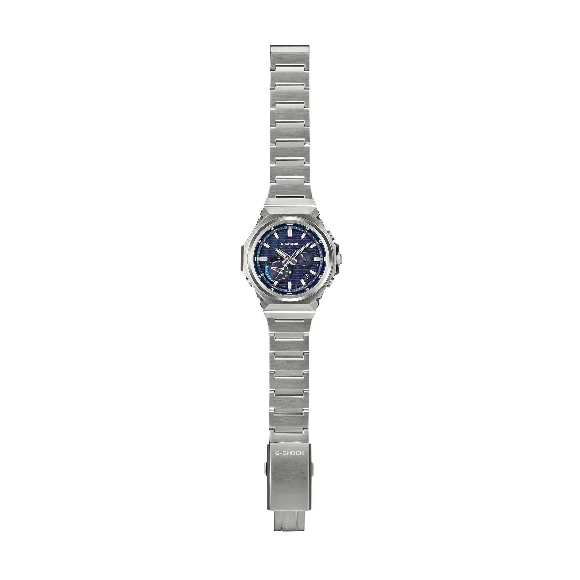 The G-SHOCK GST-B1000 Series G-STEEL Mens Watch GST-B1000D-2A reinterprets the G-SHOCK legacy with a sharper, minimalist take on functional beauty. The bezel forgoes the logo for a clean, contemporary profile, finished with vertical and circular hairline brushing and mirror polishing that catch the light from every angle, giving depth and dimension. Its solid stainless-steel band and tri-fold clasp echo the same precision, with a nod to its heritage in the familiar bezel silhouette and signature brick pattern. It pairs a blue dial and baton markers with an assured G-STEEL presence.