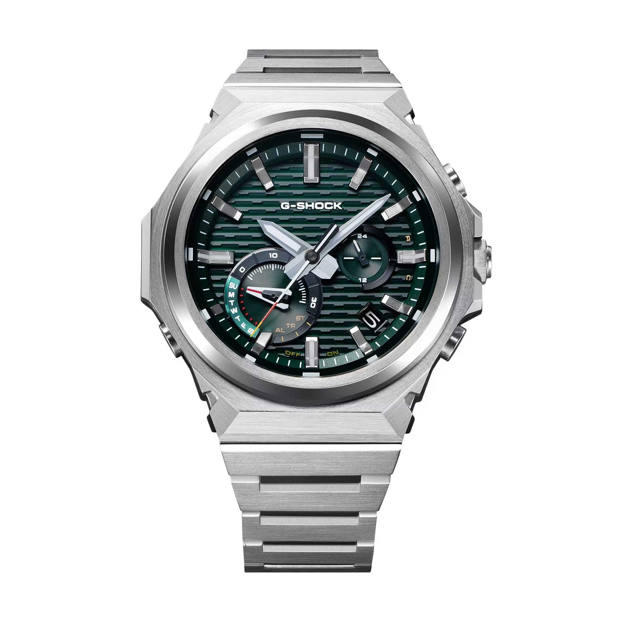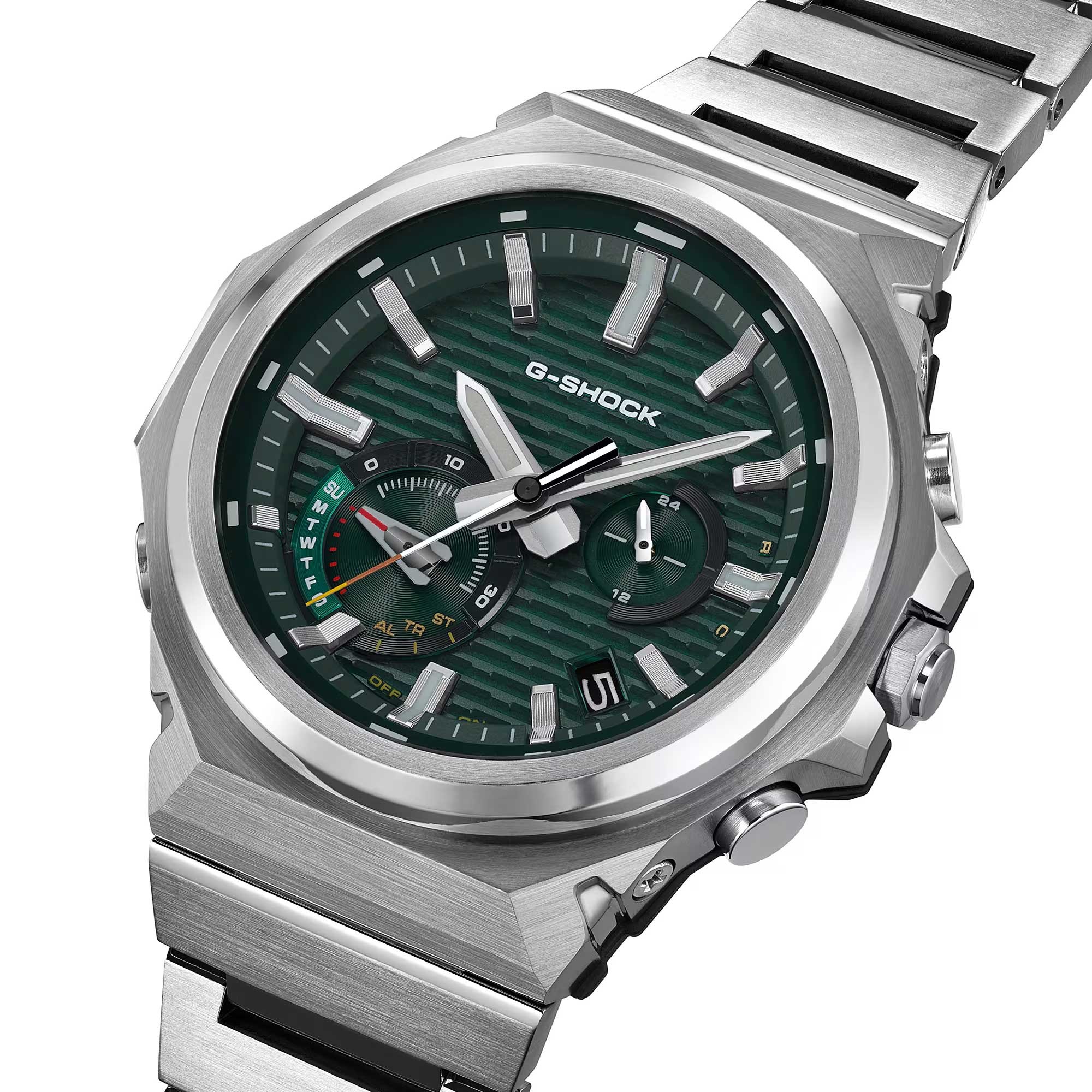 The G-SHOCK GST-B1000 Series G-STEEL Mens Watch GST-B1000D-3A reinterprets the G-SHOCK legacy with a sharper, minimalist take on functional beauty. The bezel forgoes the logo for a clean, contemporary profile, finished with vertical and circular hairline brushing and mirror polishing that catch the light from every angle, giving depth and dimension. Its solid stainless-steel band and tri-fold clasp echo the same precision, with a nod to its heritage in the familiar bezel silhouette and signature brick pattern. It pairs a green dial and baton markers with an assured G-STEEL presence.
