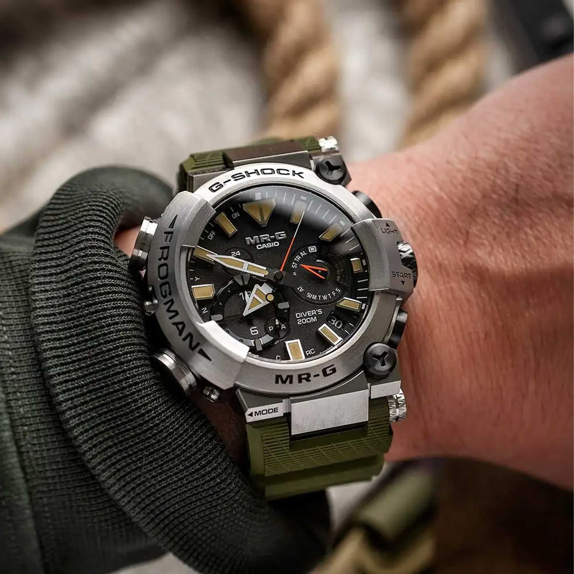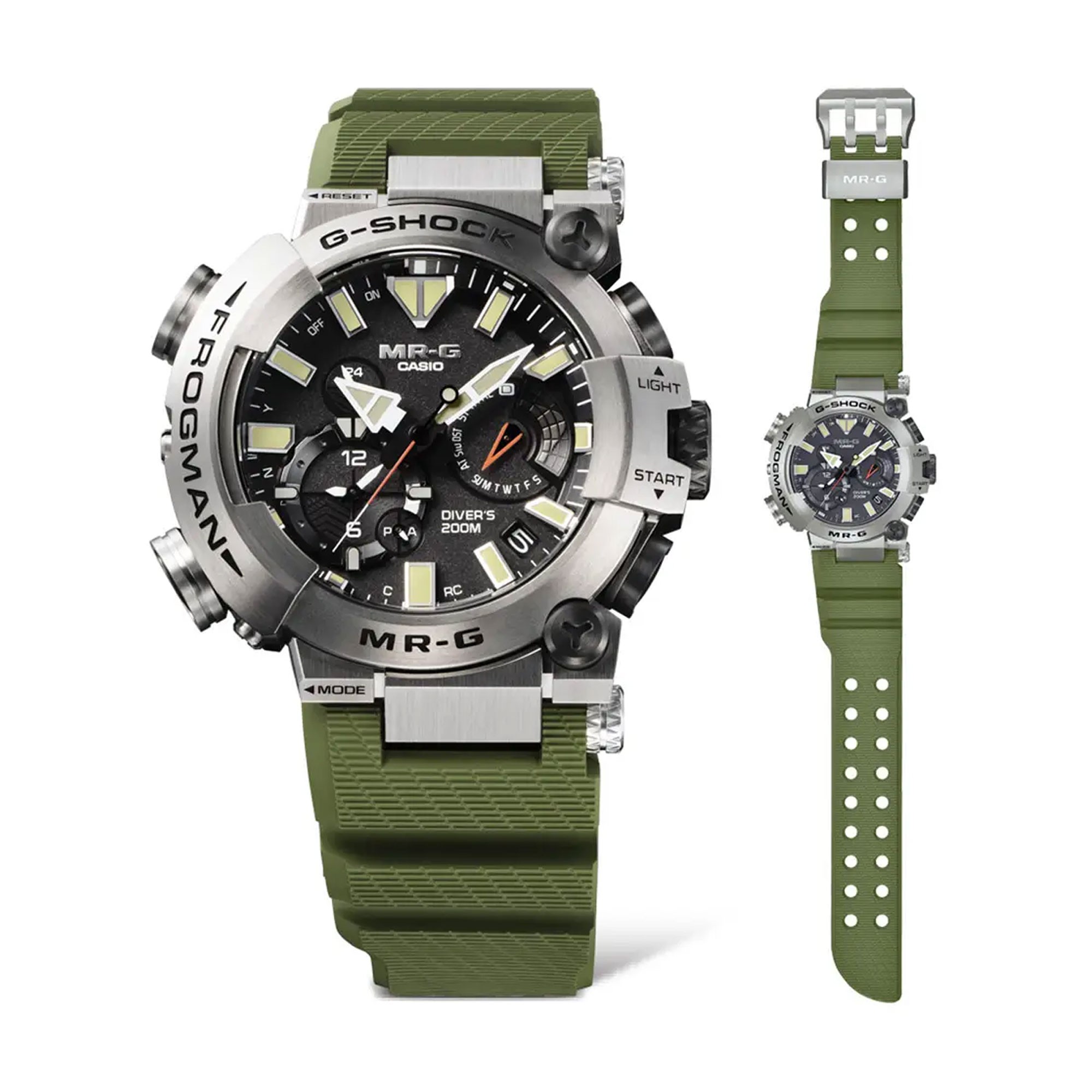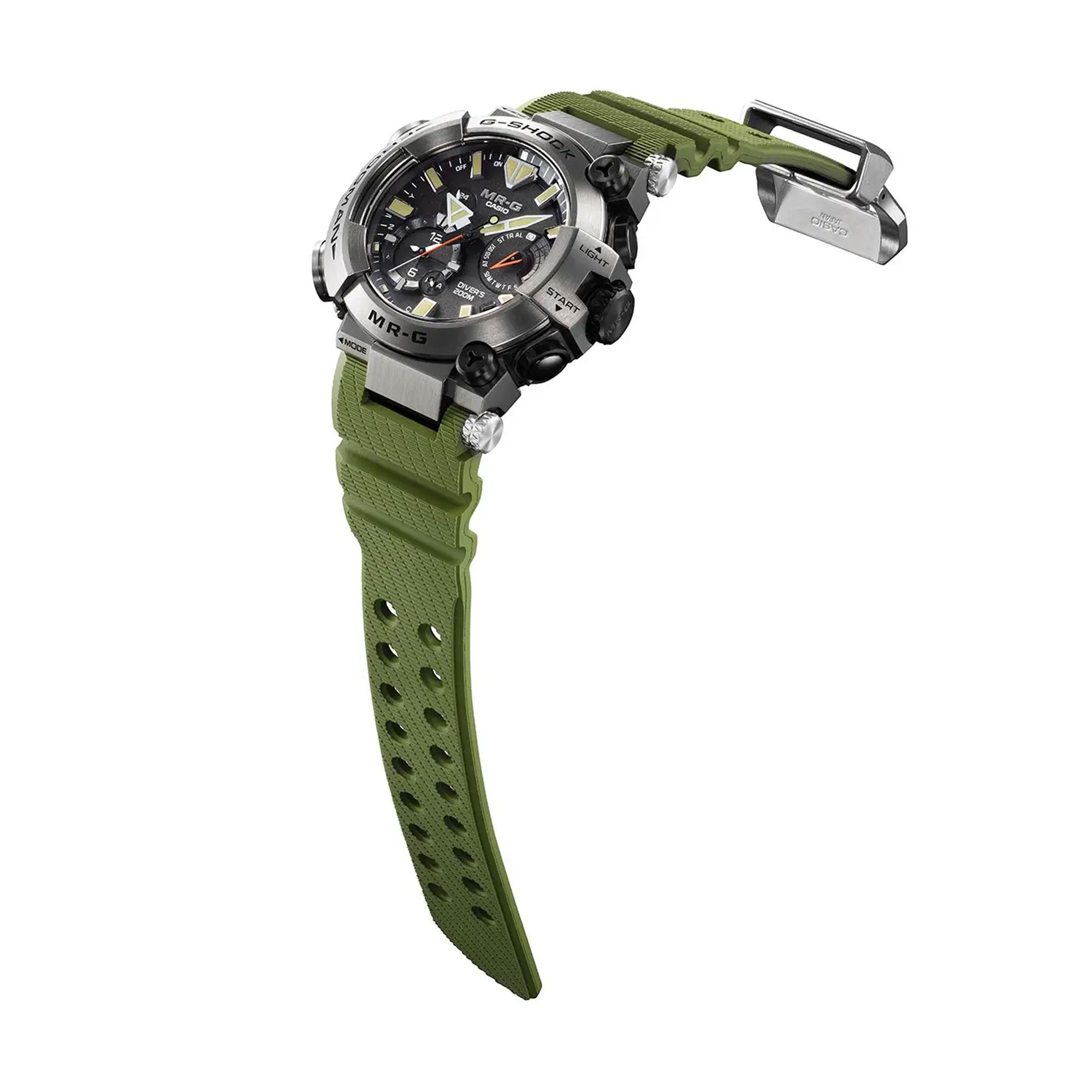Drawing design cues from the mighty goliath frog — the world’s largest amphibian — its khaki strap mirrors the creature’s earthy tones, while orange accents and beige Neobrite-coated indexes ensure visibility and flair, even in the deepest waters. The MR-G ethos shines through in every detail: a harmony of rugged performance, refined colour aesthetics, and structural artistry.