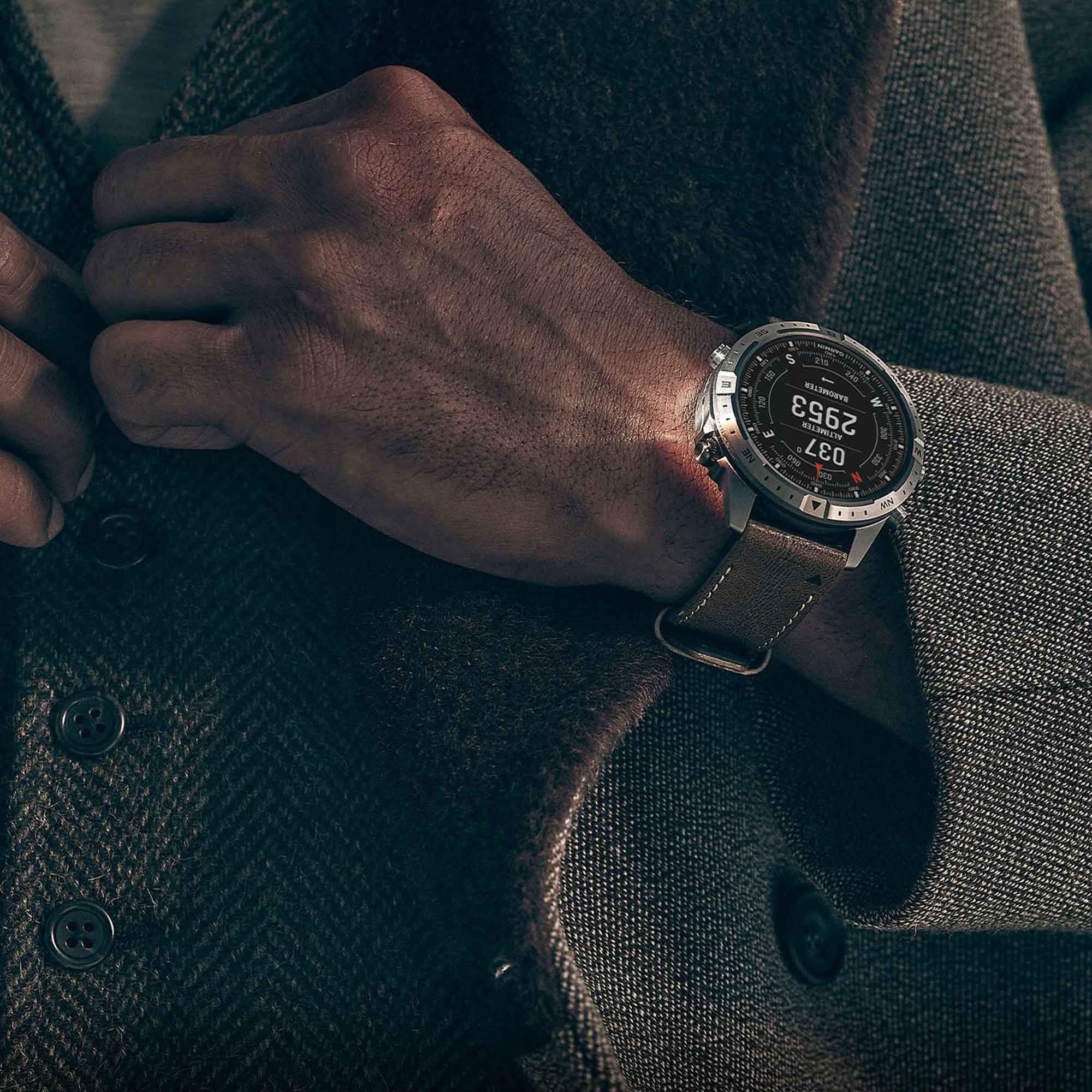 Let your next journey begin with Garmin’s MARQ® Adventurer (Gen 2), a modern watch to accompany you to any adventure. With a 3600 compass bezel, 46mm case and amoled responsive touchscreen display, this watch is designed with explorers in mind. Garmin’s monitoring capabilities such as ABC censors, ClimbPro and blood oxygen levels are setting the standard for integrated tech within the watchmaking industry. This sleek design can take you from day to night with a leather and FKM rubber hybrid strap: a watch for every occasion.