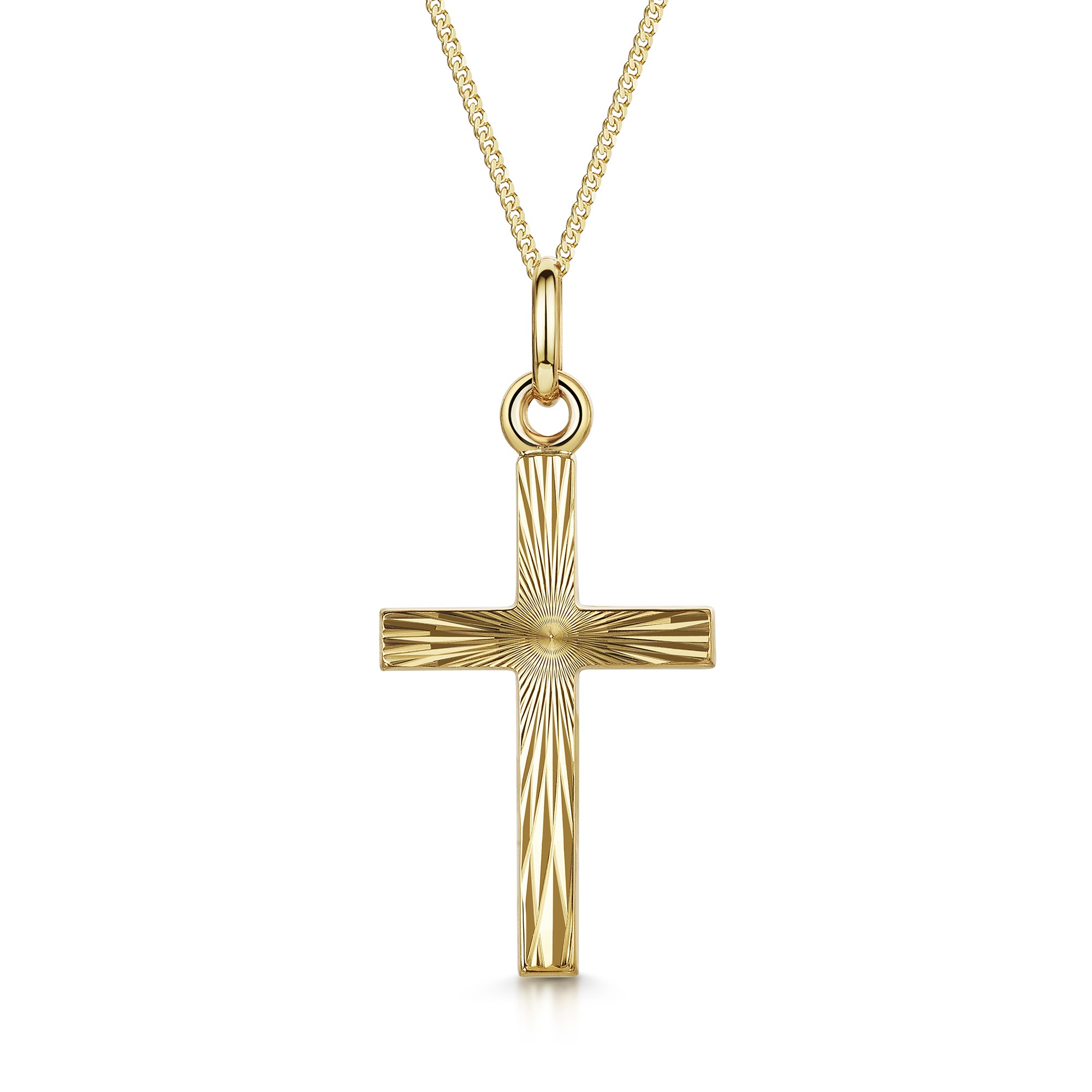 Introducing the 9ct Yellow Gold 15mm x 26mm Diamond Cut Cross Gents Pendant by Chisholm Hunter. This sophisticated necklace for him combines timeless design with a modern twist. Crafted from quality yellow gold, it features a striking diamond cut finish that catches the light beautifully, making a statement without being ostentatious.