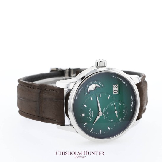 Glashütte Original represents German watchmaking art starting from its establishing in 1845. The deep sense of boldness and beauty combined with reliable precision and lasting values of the brand has made it one of the most reputable watch company of the world. Moreover, they has founded an own school of watchmaking to pass on their expertise.PanoMaticLunar is colour-play in green from Pano Collection. Its exquisitely finished movement Glashütte three-quarter plate with stripe finish screw balance duplex swan-neck fine adjustment skeletonized rotor with 21 ct gold oscillation weight bevelled edges polished steel parts balance bridge engraved by hand partially with perlage. This model use CALIBRE automatic movement 90-02 and functions with small second (off-centre) Second stop Panorama Date hour and minute (off-centre) moon phase. Its stainless steel case, satin-brushed and polished, sapphire crystal on top and bottom, waterproof up to 5 bar. Dial is varnished in green and black with dégradé effect with appliques and match with Louisiana alligator nubuck leather strap brown with buckle