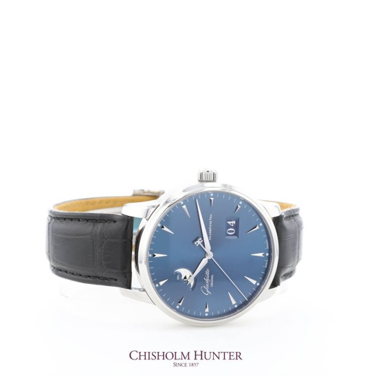 Glashütte Original represents German watchmaking art starting from its establishing in 1845. The deep sense of boldness and beauty combined with reliable precision and lasting values of the brand has made it one of the most reputable watch company of the world. Moreover, they has founded an own school of watchmaking to pass on their expertise.Senator Excellence Panorama Date Moon Phase is Glashütte Original extends Senator Excellence line. Its exquisitely finished movement Glashütte three-quarter plate with stripe finish screw balance with 4 adjustment screws silicon spring fine adjustment by adjustment screws skeletonized rotor with 21 ct gold oscillation weight bevelled edges polished steel parts with perlage. This model use CALIBRE automatic movement 36-04 and functions with second stop Panorama Date hour and minute (central) moon phase. Its stainless steel case, crown with double G-logo, screwed case back, waterproof up to 5 bar. Dial is galvanized blue with sunray decoration, hour markers with luminous spots, white gold appliques, hands rhodium plated and finally match with Louisiana Alligator leather strap black, stainless steel buckle.