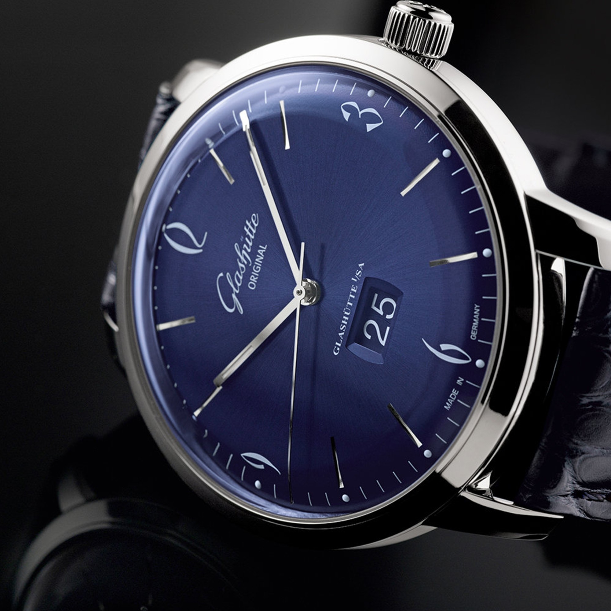 Glashütte Original represents German watchmaking art starting from its establishing in 1845. The deep sense of boldness and beauty combined with reliable precision and lasting values of the brand has made it one of the most reputable watch company of the world. Moreover, they has founded an own school of watchmaking to pass on their expertise.Sixties Panorama Date is a tribute to the most exciting decade of the 20th century. Its exquisitely finished movement Glashütte three-quarter plate with stripe finish smooth balance rim swan-neck fine adjustment skeletonized rotor with 21 ct gold oscillation weight bevelled/polished edges polished steel parts. This model use CALIBRE automatic movement 39-47 and functions with second stop Panorama Date hour and minute (central). Its stainless steel case, crown with double G-logo, screwed case back, waterproof up to 3 bar. Dial is galvanized blue, markers milled, hands inlaid with Super-LumiNova. Finally match with Louisiana Alligator leather strap blue, buckle stainless steel satin-finish.