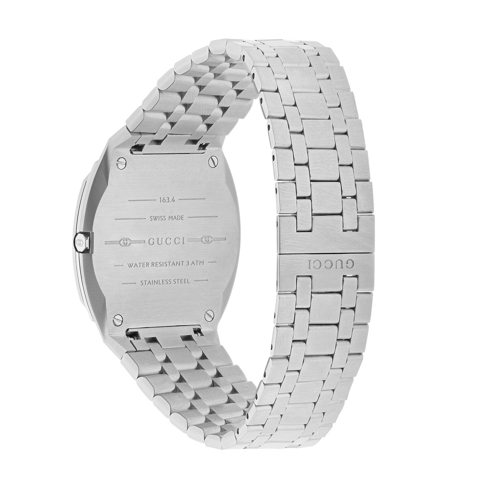 The smooth curved silhouette of the GUCCI 25H 34mm unisex Watch YA163402 takes inspiration from modern architecture. The 34mm stainless steel case holds a brass dial with the iconic interlocking G monogram. The watch is presented on a sleek five link steel bracelet that connects to the case in a streamlined design. This timepiece is powered by a reliable quartz movement.