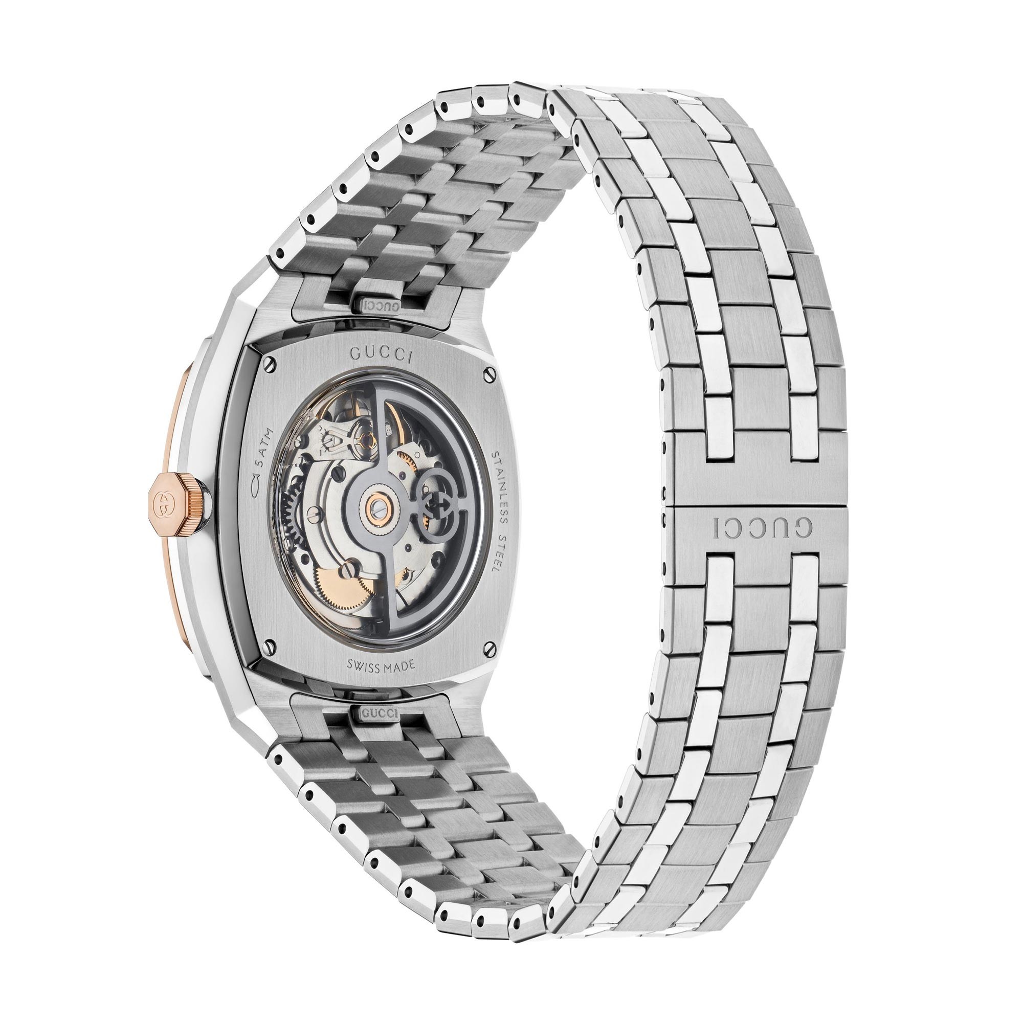 The latest GUCCI 25H collection showcases a streamlined silhouette, featuring refined elements that enhance the watch's sleek design. Powered by an automatic movement, the accessory is defined by a steel interchangeable bracelet and a stainless steel case with black dial.