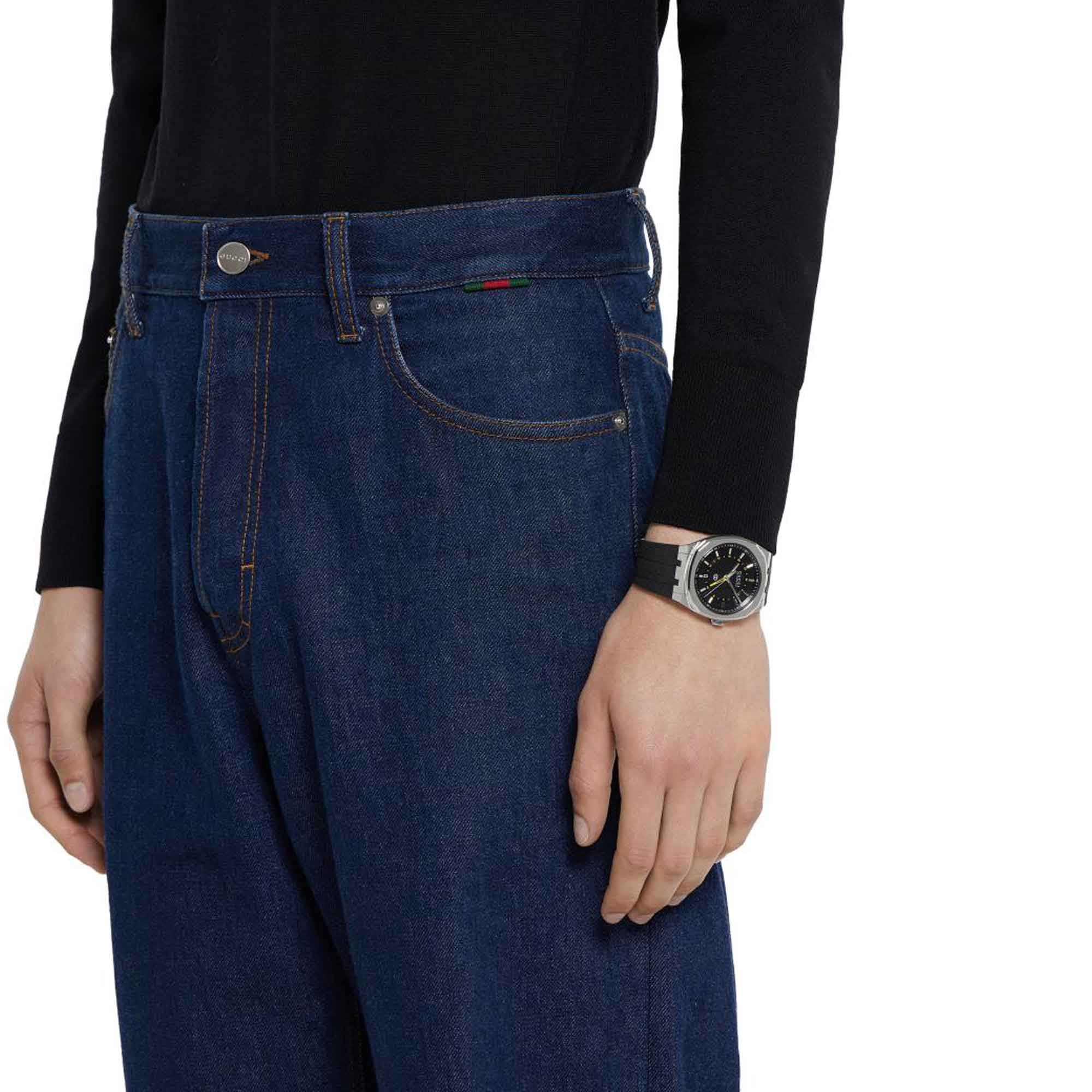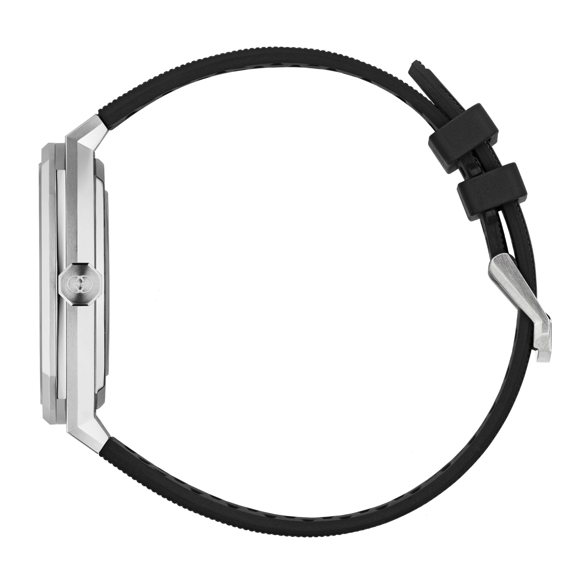 The balck rubber strap offers comfort and adaptability, securing with a pin buckle for ease of use. Water-resistant up to 50 metres, this watch caters to an active lifestyle while maintaining its luxurious appearance. With a power reserve of 50 hours, the Gucci 25H YA163353 combines practicality with timeless design.