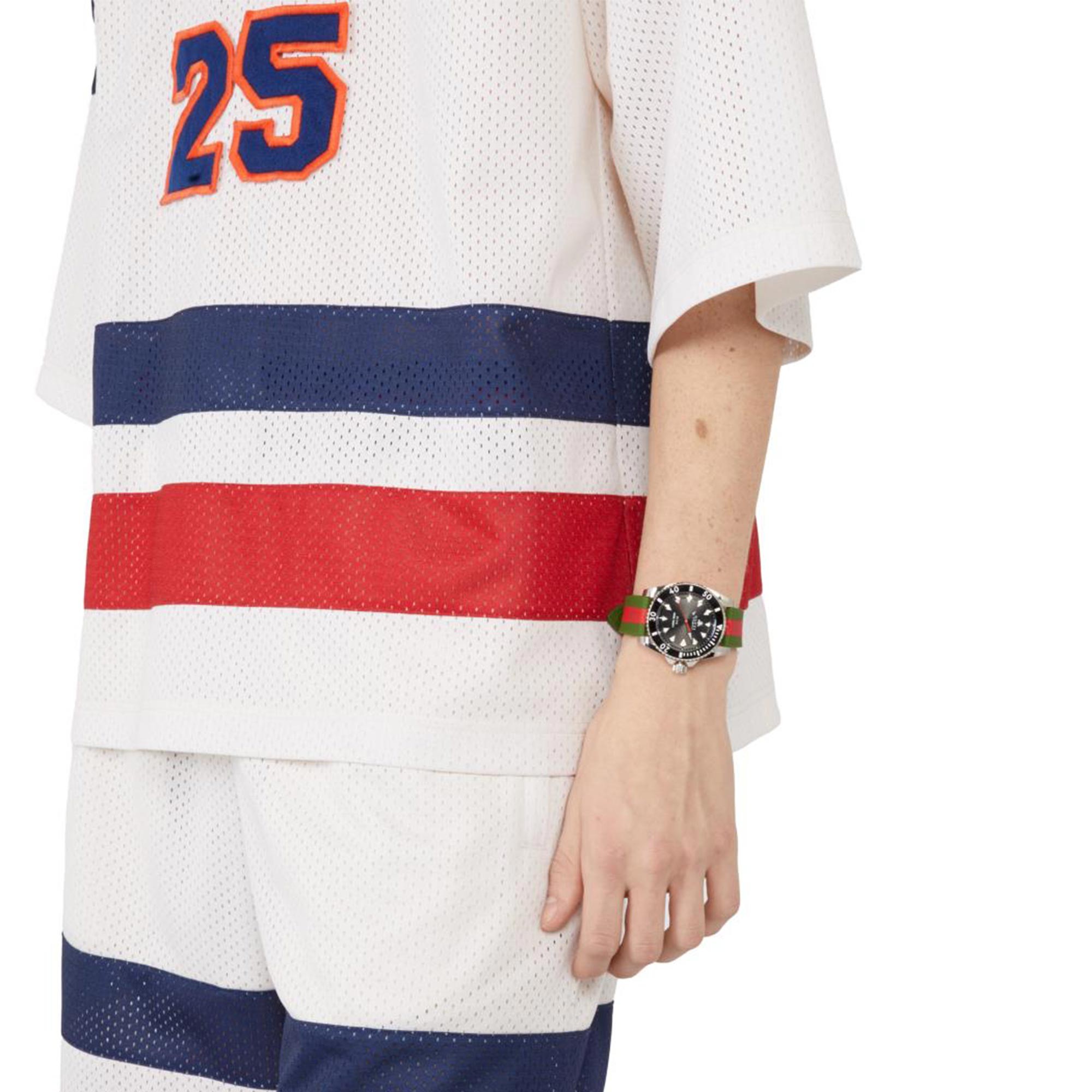 Founded in Florence in 1921, GUCCI is one of the world's leading luxury fashion brands. Combining timeless style and contemporary fashion in a unique way. With an incredible level of craftsmanship and a keen eye for detail, these GUCCI timepieces will help you keep track of time, in fine Italian style. Inspired by a diver's watch design, this GUCCI Dive Men's Watch YA136349, is the perfect combination of sportsmanship and an iconic nod to the GUCCI house roots. Features a 40mm stainless steel case, a black numbered bezel, luminescent hour markers and a date function. Presented on a vibrant and iconic green and red nylon stripped strap, this timepiece is water resistant up to 300 metres. Shop now at Chisholm Hunter.
