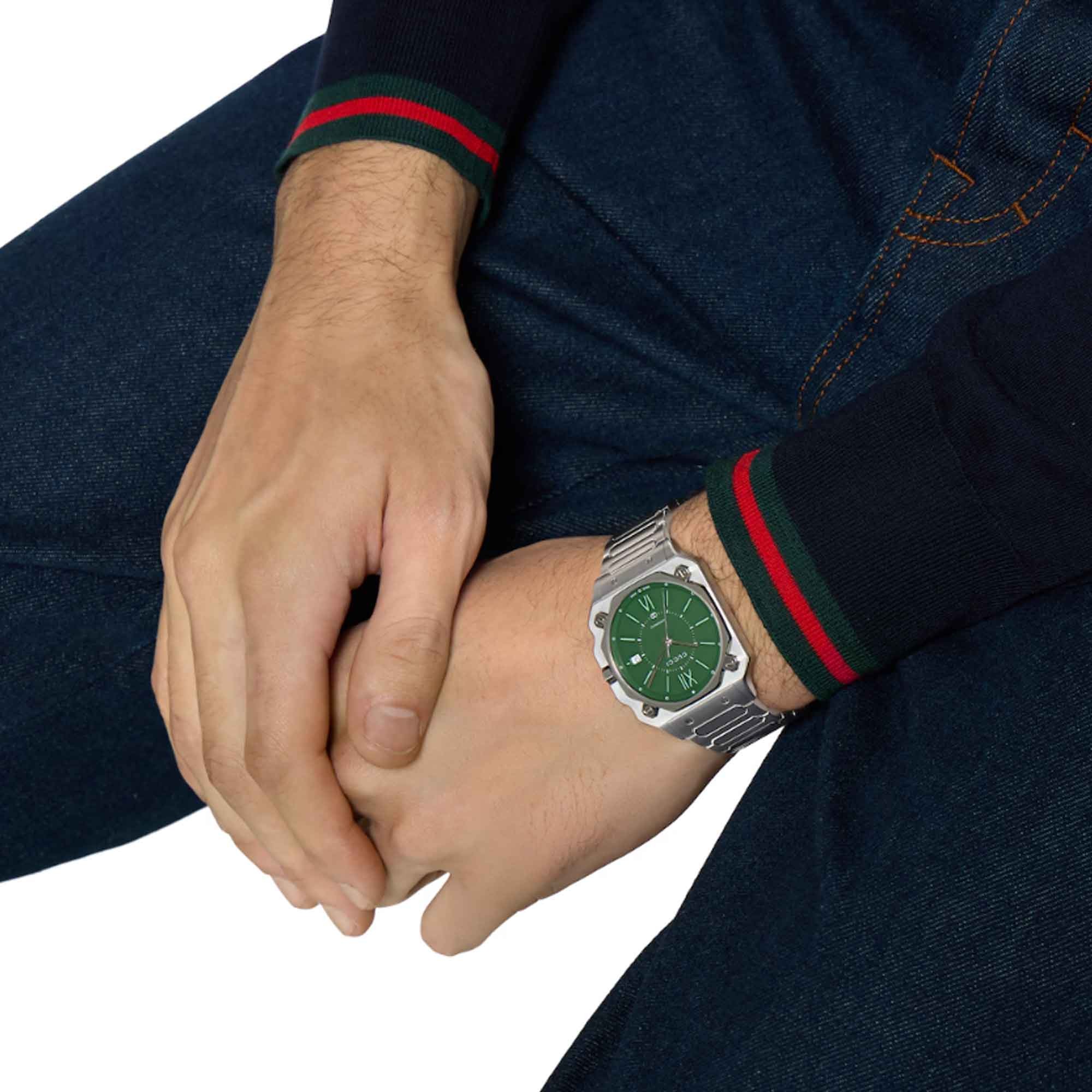 The Gucci G-Flat 36mm Watch YA166404 is a sophisticated automatic timepiece designed for women who appreciate luxury. The watch features a striking green dial adorned with Roman numerals and batons, offering both elegance and readability. The sapphire crystal glass provides durability and scratch resistance, ensuring that your watch maintains its beauty over time.
