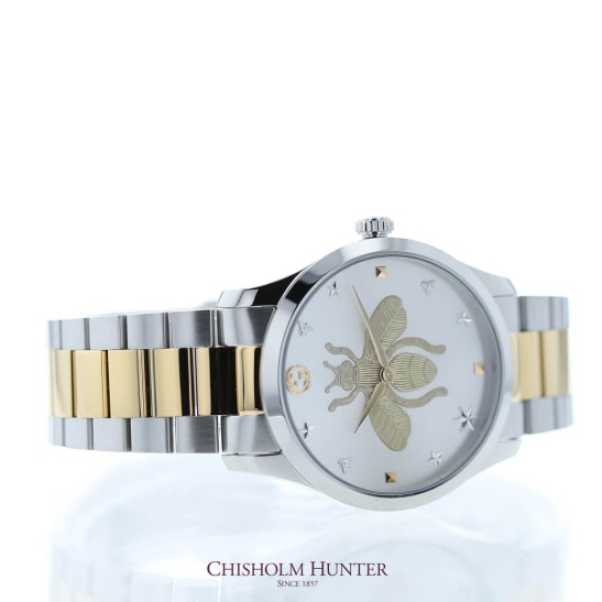 Gucci G-Timeless collection showcases true timeless Italian style fused with Swiss expert craftsmanship. This collection features a range of fashionable watches for men and women all featuring classic Gucci signature design. Gents Gucci G-timeless collection gents yellow gold PVD and stainless steel bracelet watch with steel case. Round silver dial with yellow gold tone detailing the iconic Gucci bee motif, surrounded in yellow gold PVD Gucci branded symbols with the branded GG at 12 o'clock. The Tone bracelets compliments this dial which is protected by sapphire crystal glass. Water resistant up to 50 metres. Complete with Gucci presentation packaging with 2 years manufacturers guarantee.