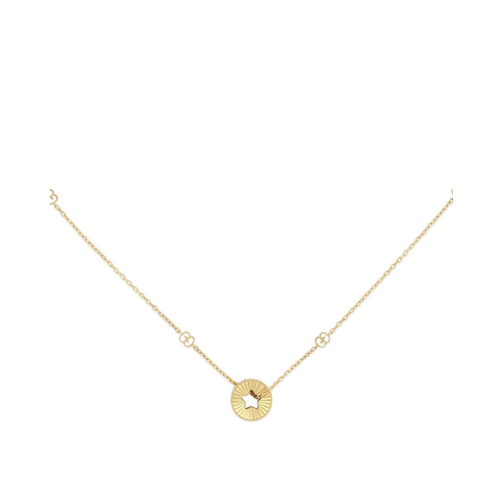 This precious necklace is presented in 18ct yellow gold with a delicate chain featuring the GG motif. The circular focal point of the pendant features a cut-out star, recalling the Gucci Cosmogonie fashion show. We offer Gucci Official 1 Year Guarantee and official Gucci packaging, discover this luxury Italian brand at Chisholm Hunter today.