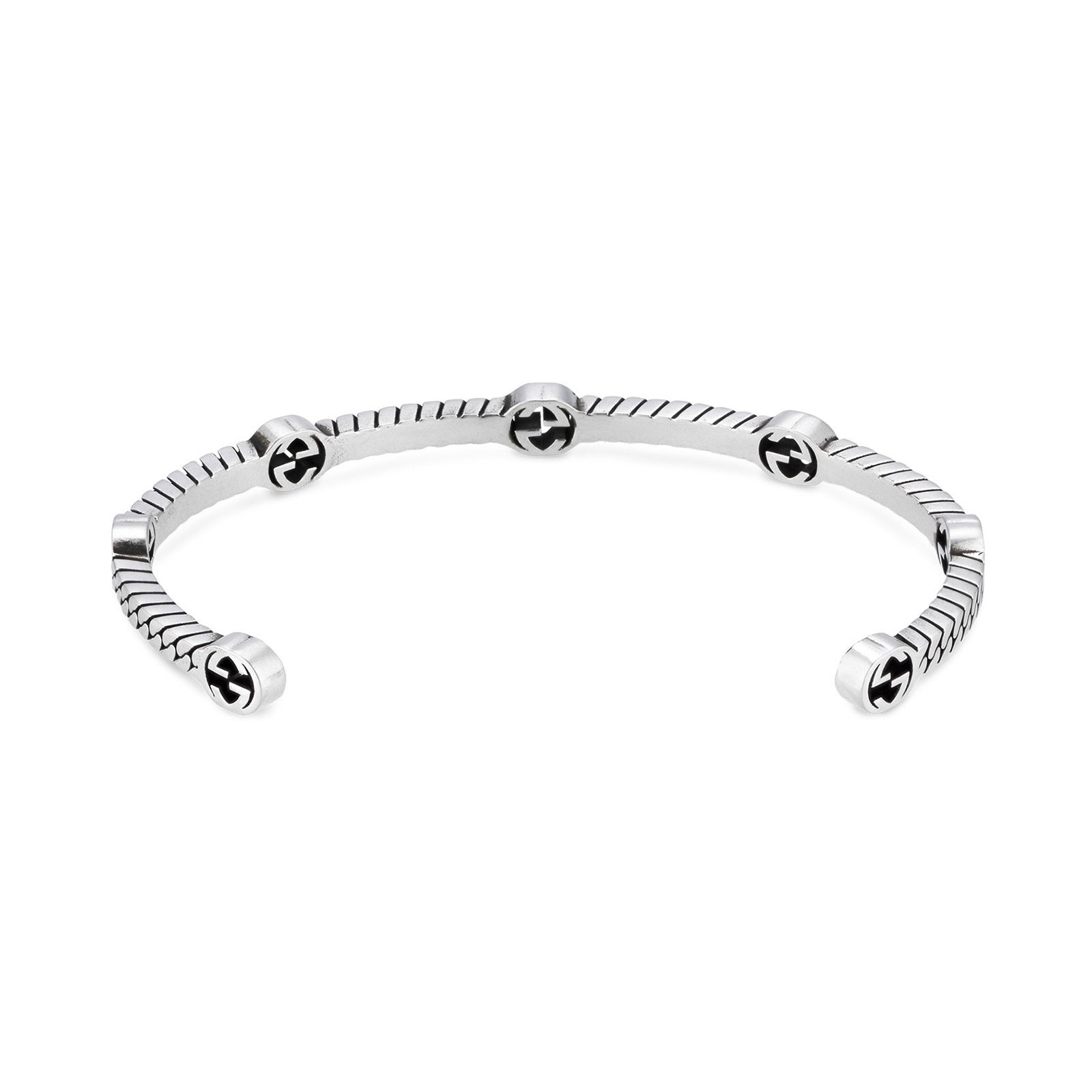 Gucci Interlocking G Unisex Sterling Silver 3.5mm Cuff Bangle With XS Multi GGs Size 18. The interlocking G design was originally championed by GUCCI in the 70's, it is now one of the fashion houses key motif's. Showcase an iconic piece of the fashion house with this beautiful GUCCI Interlocking G bangle. Set in 925 Sterling Silver this bangle designed for both ladies and gentlemen radiates a contemporary yet sophisticated look.