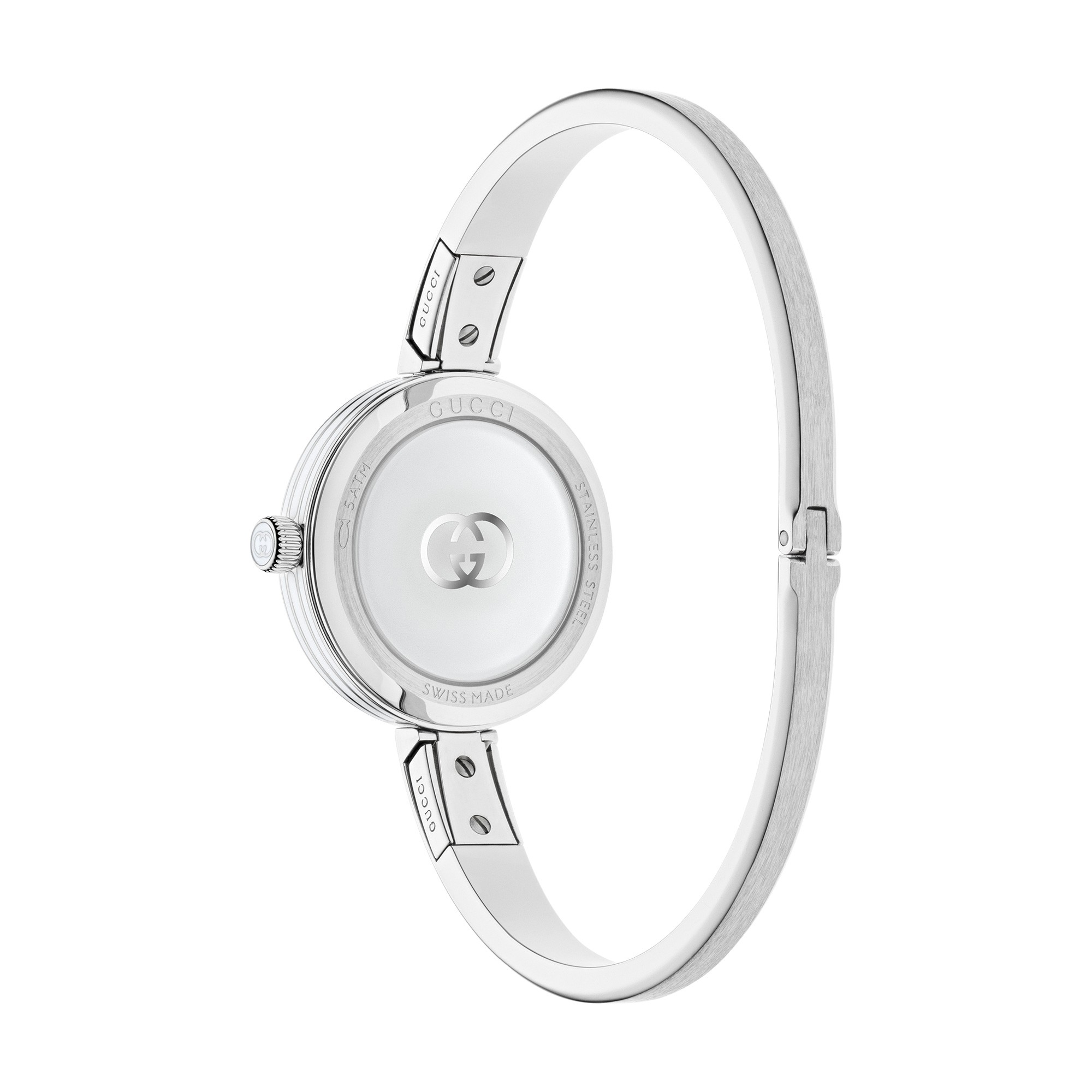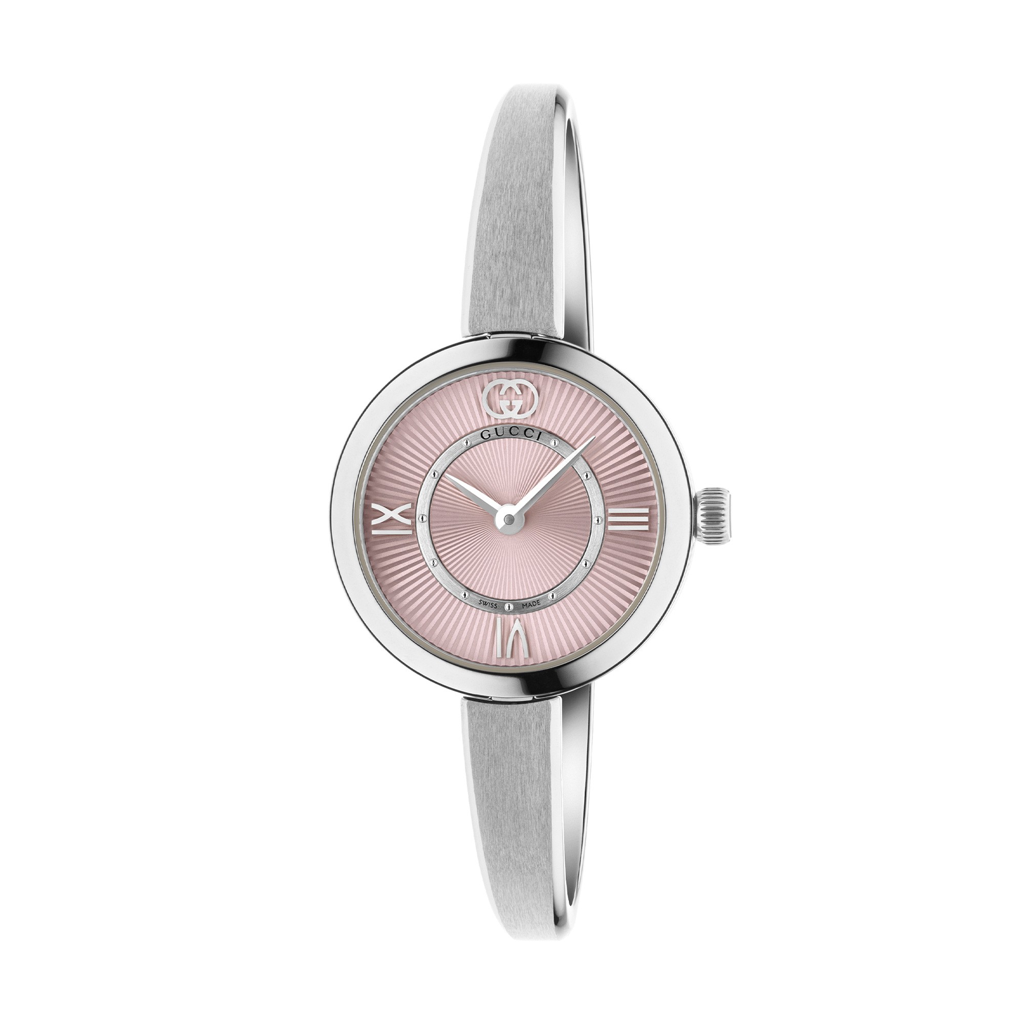 The metal bangle strap offers a secure fit and complements the overall design perfectly. This watch is water-resistant up to 50 metres, making it suitable for daily wear and various occasions. Packaged in luxurious Gucci presentation packaging, it’s an exceptional gift for her.