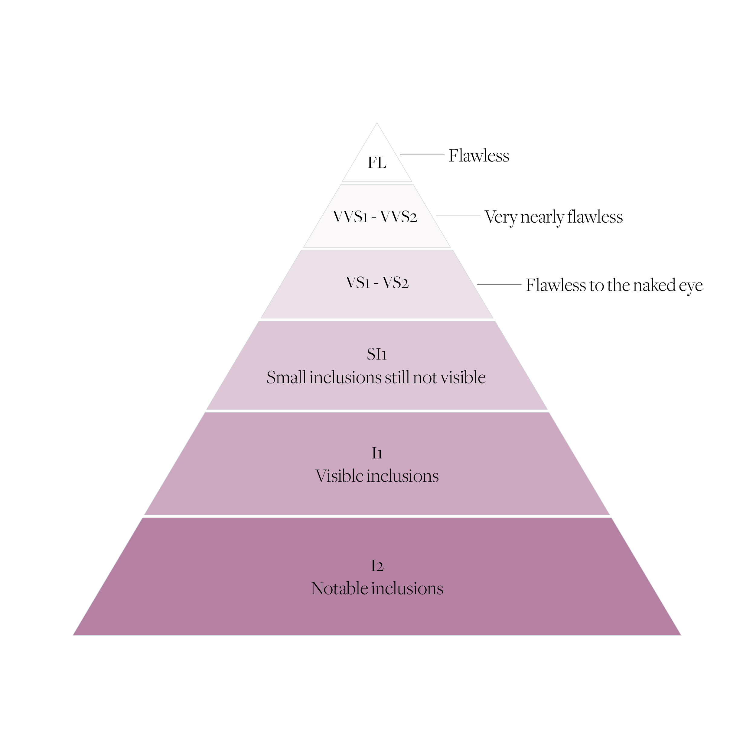 Diamond clarity refers to the presence (or absence) of natural inclusions and blemishes within the stone, typically visible only under magnification. These tiny internal characteristics form during a diamond’s natural growth process when other minerals or crystals become trapped. While they don’t always affect beauty to the naked eye, they can influence how light travels through the diamond, impacting its brilliance. A flawless diamond, free from internal imperfections, is extremely rare and highly valued. At Chisholm Hunter, we hand-select diamonds with exceptional clarity to ensure every piece offers maximum sparkle, purity, and prestige.
