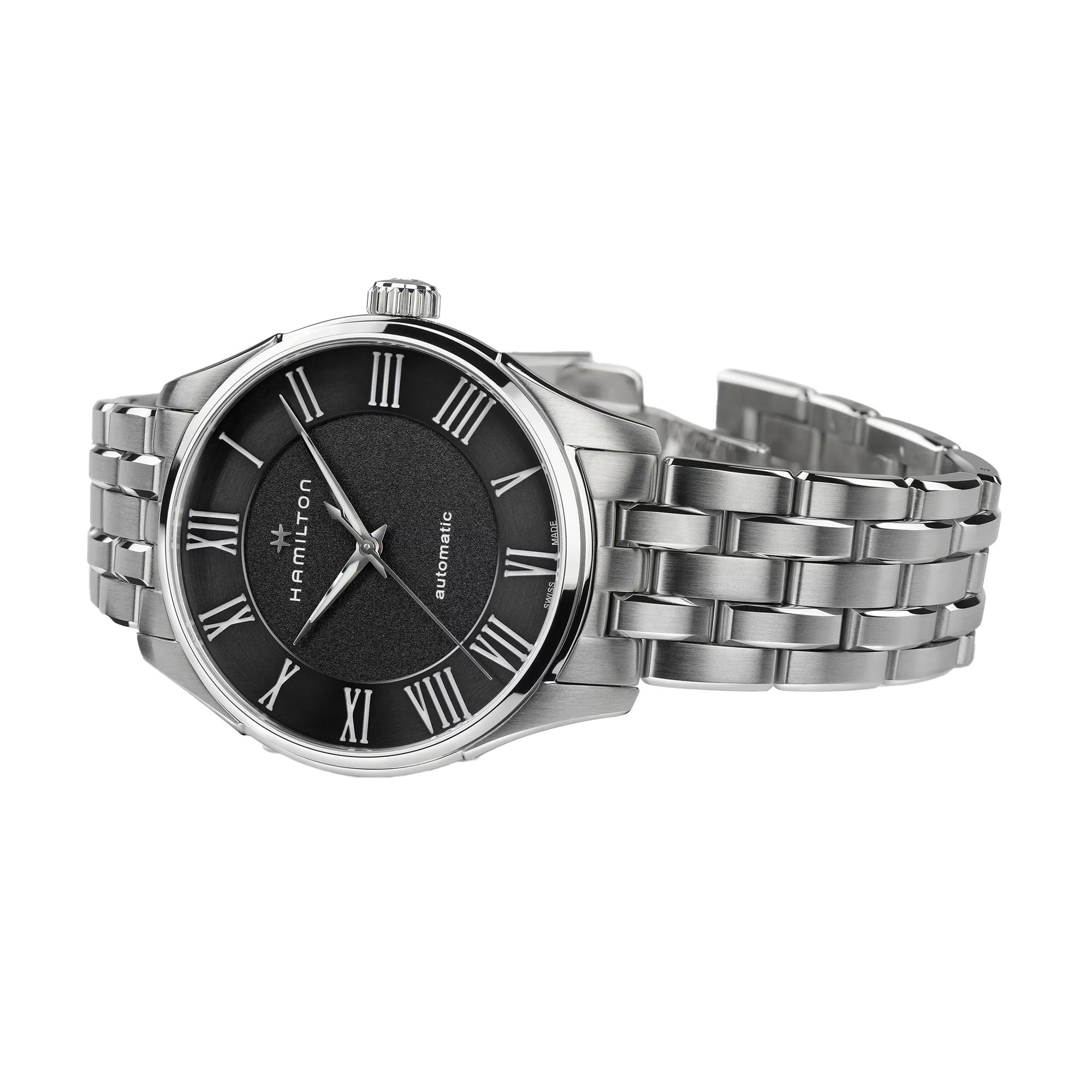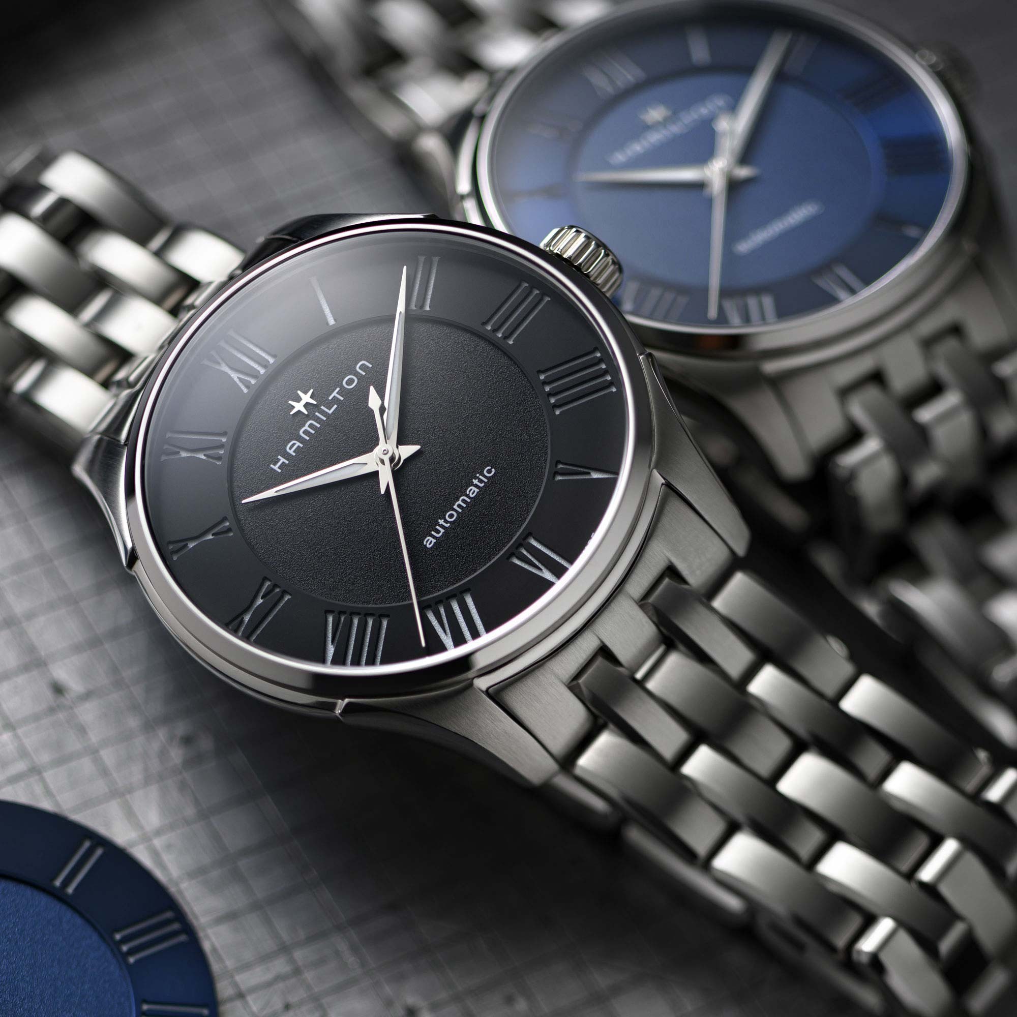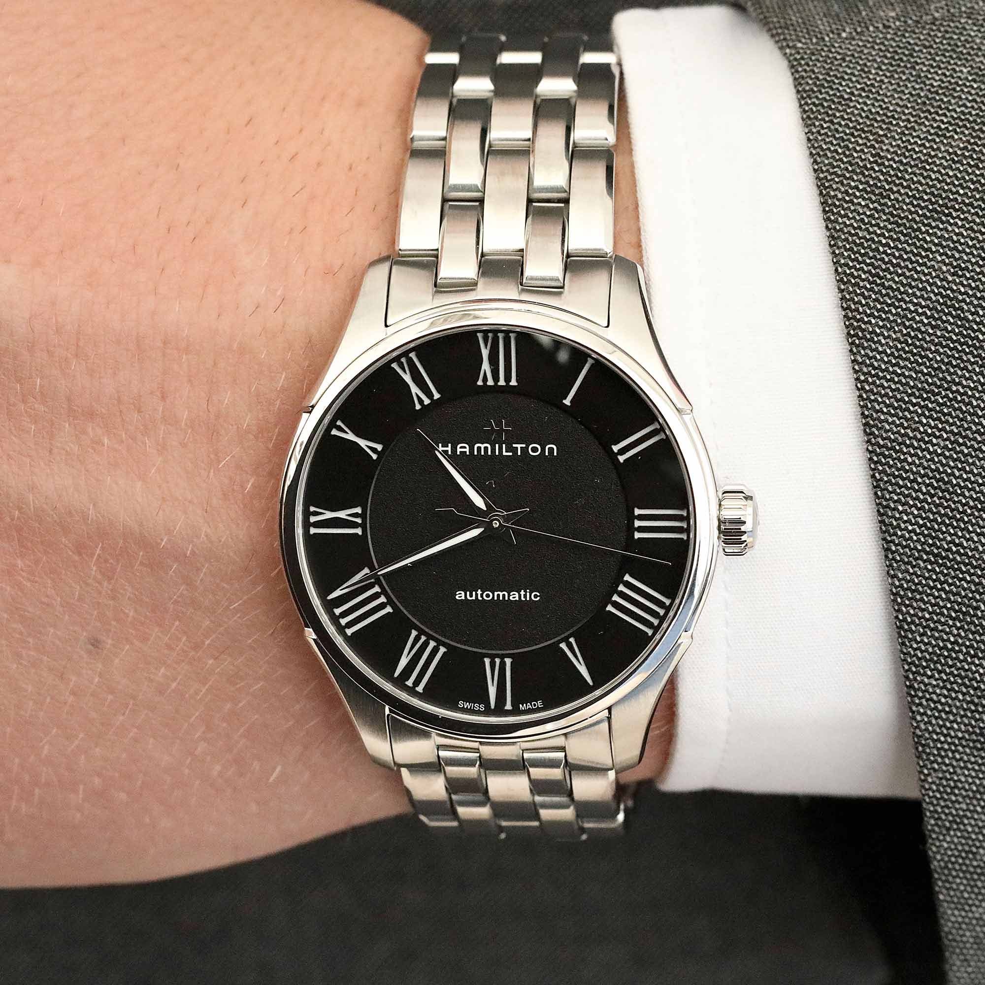 The Hamilton Jazzmaster Automatic is a perfect showcase for Hamilton's design language. Traditional design cues such as the classic black dial with roman numeral hour-markers combine seamlessly with the sharp, modern hands, 80-hour power reserve, anti-magnetic hairspring and automatic H-10 calibre to make for a fantastic demonstration of Hamilton's innovation meets tradition approach.