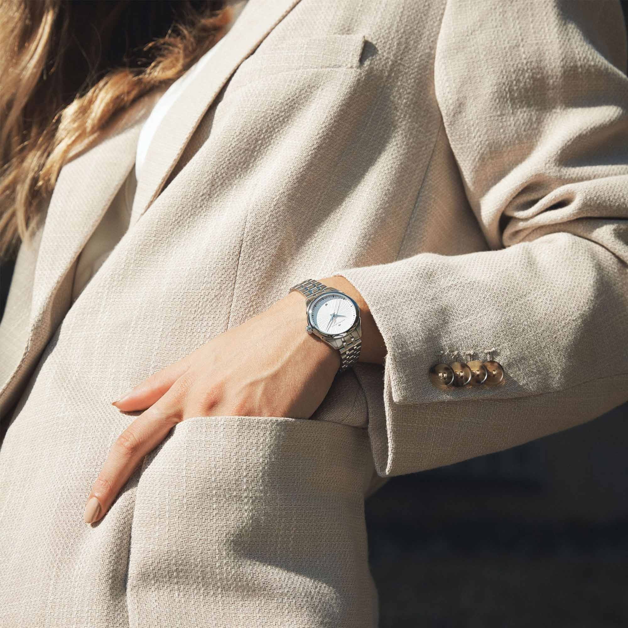 Graceful lines give the illusion of motion on the silver white, midnight blue and black velvet dial of our Jazzmaster Lady Quartz. Paired with a sleek bracelet or soft-touch leather strap, this sophisticated 30mm timepiece elevates any look.