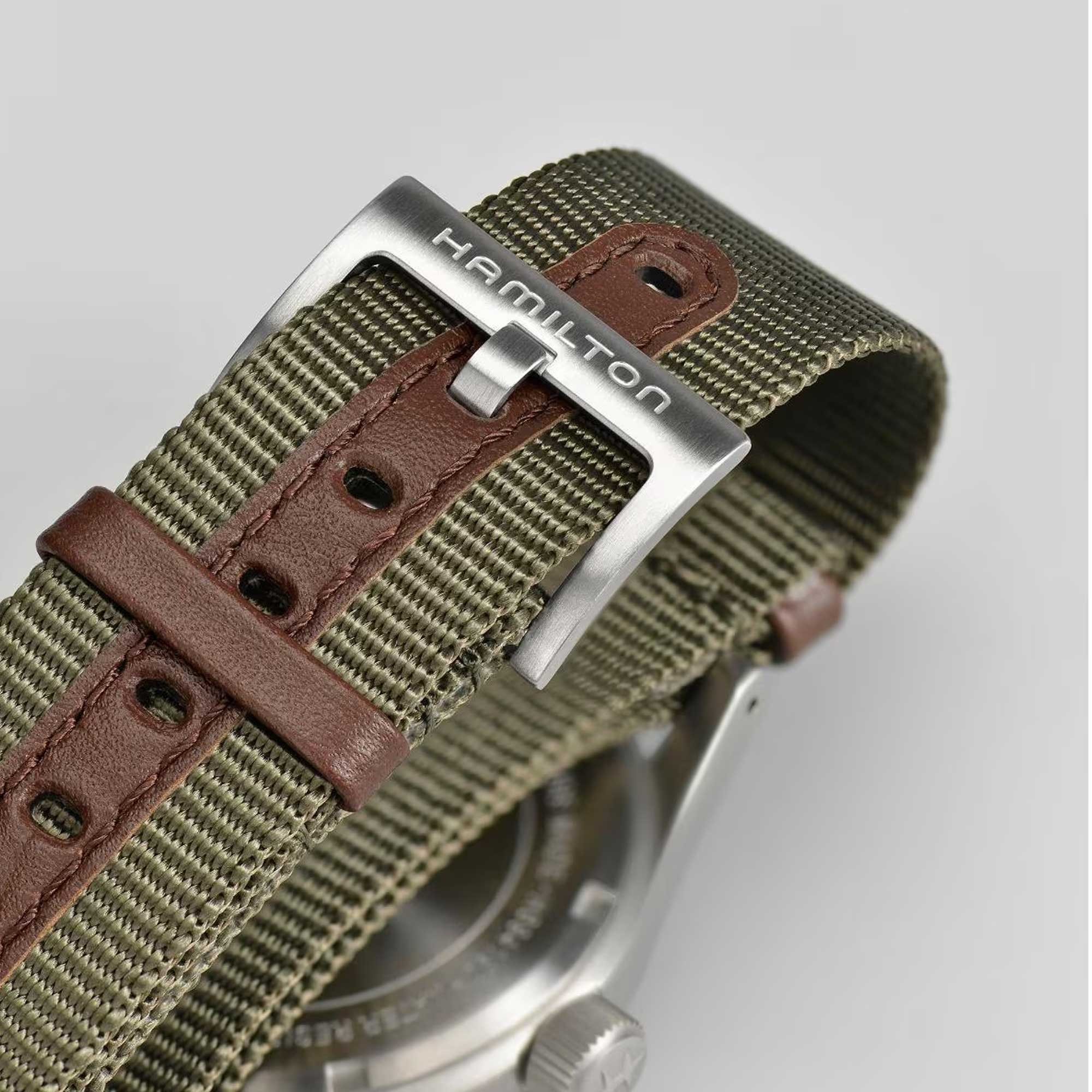 Featuring a 38mm matte stainless steel case, 3-hand display, luminescent numerals on a dark dial, 12 and 24 hour time as well as a robust Nato strap, the new Khaki Field Mechanical is a faithful recreation of the original from 1960 and honours Hamilton's authentic military heritage whilst ensuring an 80-hour power reserve thanks to the handwound calibre H-50.