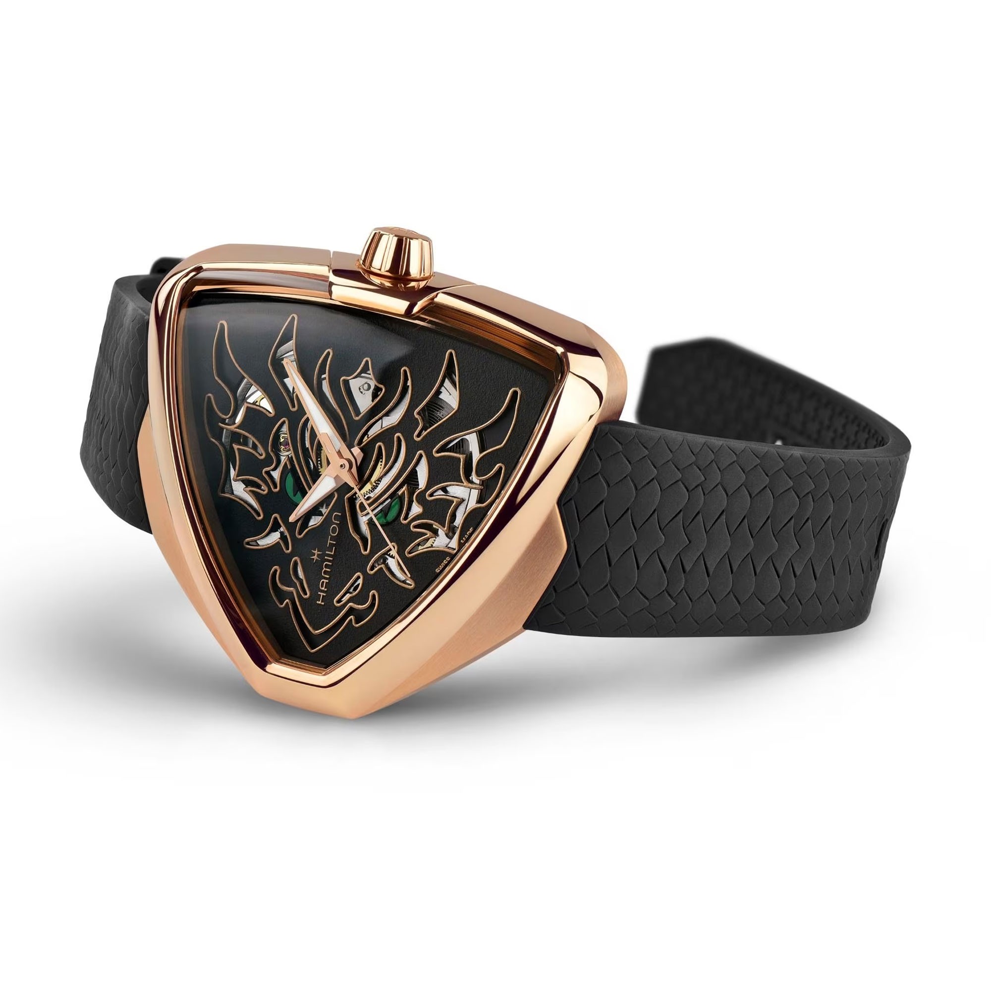 Hamilton has once again showcased their mastery in creating eye-catching timepieces as the Ventura Elvis80 Skeleton features a unique skeletonised design, allowing a glimpse into the intricate inner workings of the watch. Adding to its beauty, the rose gold dauphine handset has been coated with a luminescent material, enabling easy visibility even in the dark. The iconic Hamilton logo rests at the 9 o'clock position, a symbol of the brand's long-standing legacy of exceptional craftsmanship.