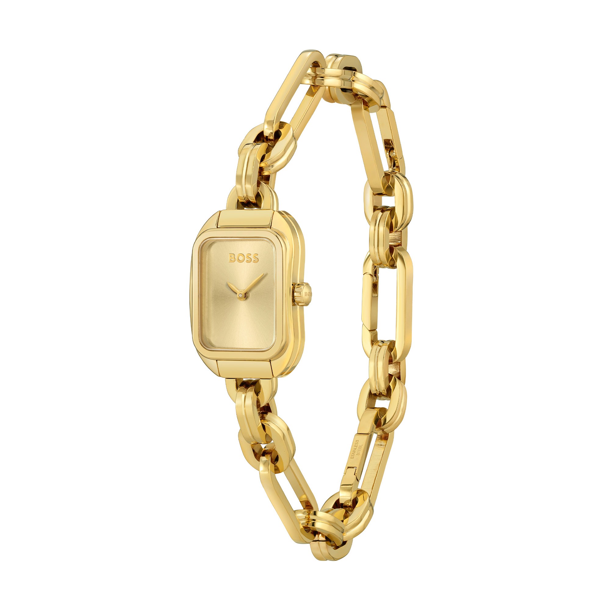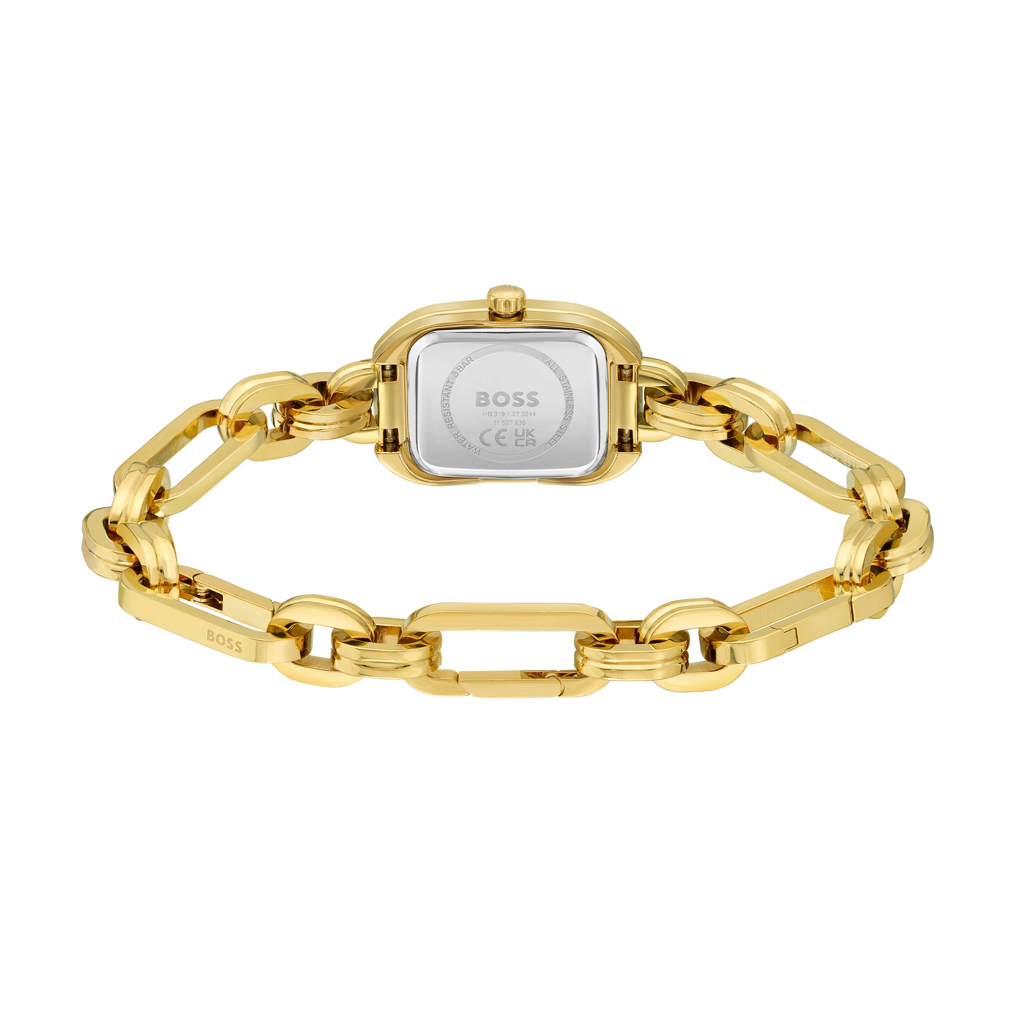 Her style, her statement. The vintage-inspired yet utterly modern BOSS Hailey is a unique two-hand Jewellery watch with a chain-link bracelet that can be double-wrapped with coordinating pieces from the BOSS Jewellery collection of the same name. With a petite, softly shaped rectangular case and light-reflecting sunray dial, the graceful watch is offered with the option of a sparkling crystal bezel for an even more glamorous finish.