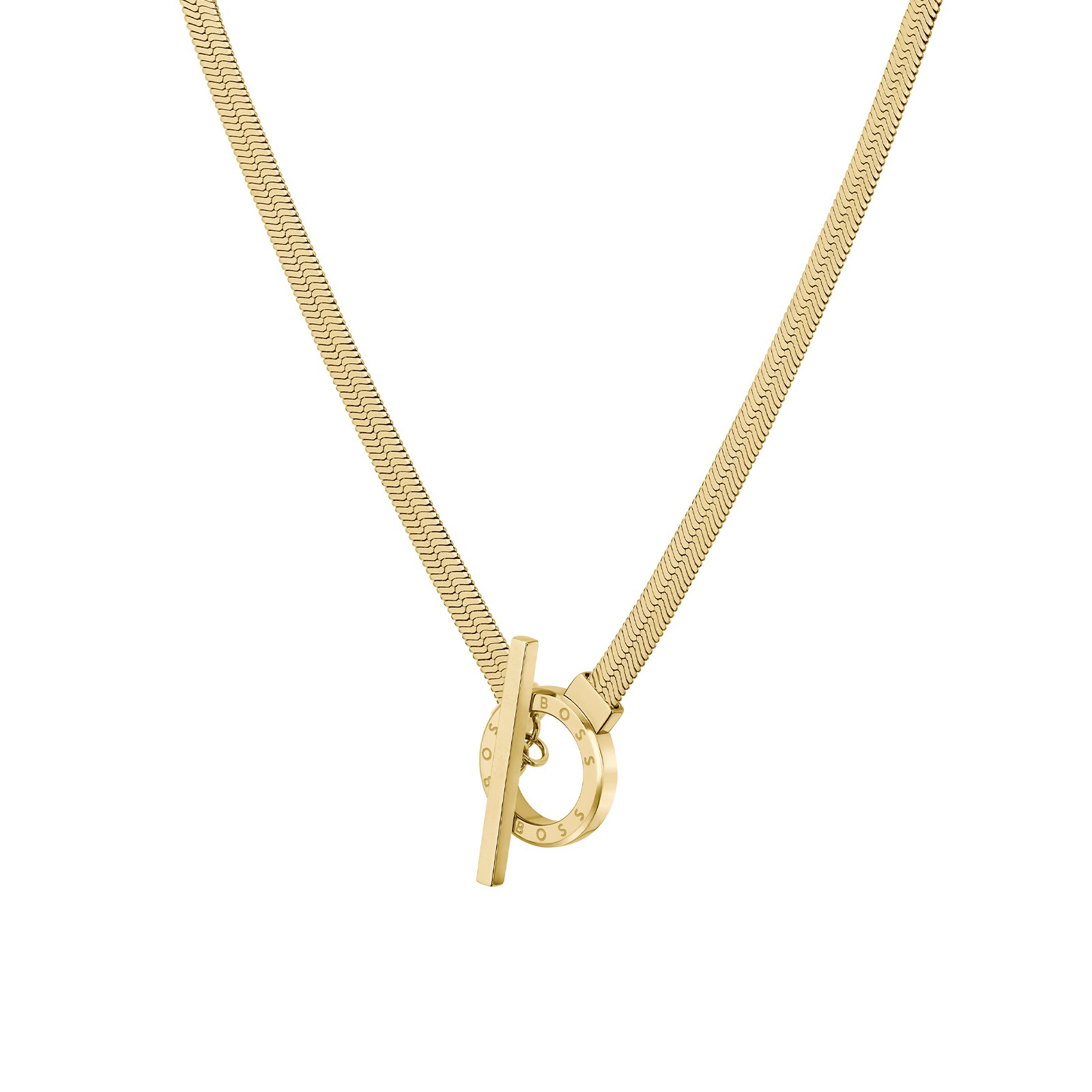 Modern minimalism in focus: the Zia necklace and bracelet from BOSS Jewellery unite a silky herringbone chain with a branded ring and toggle closure for a simple, chic aesthetic. Effortlessly capturing the understated elegance of the BOSS woman.