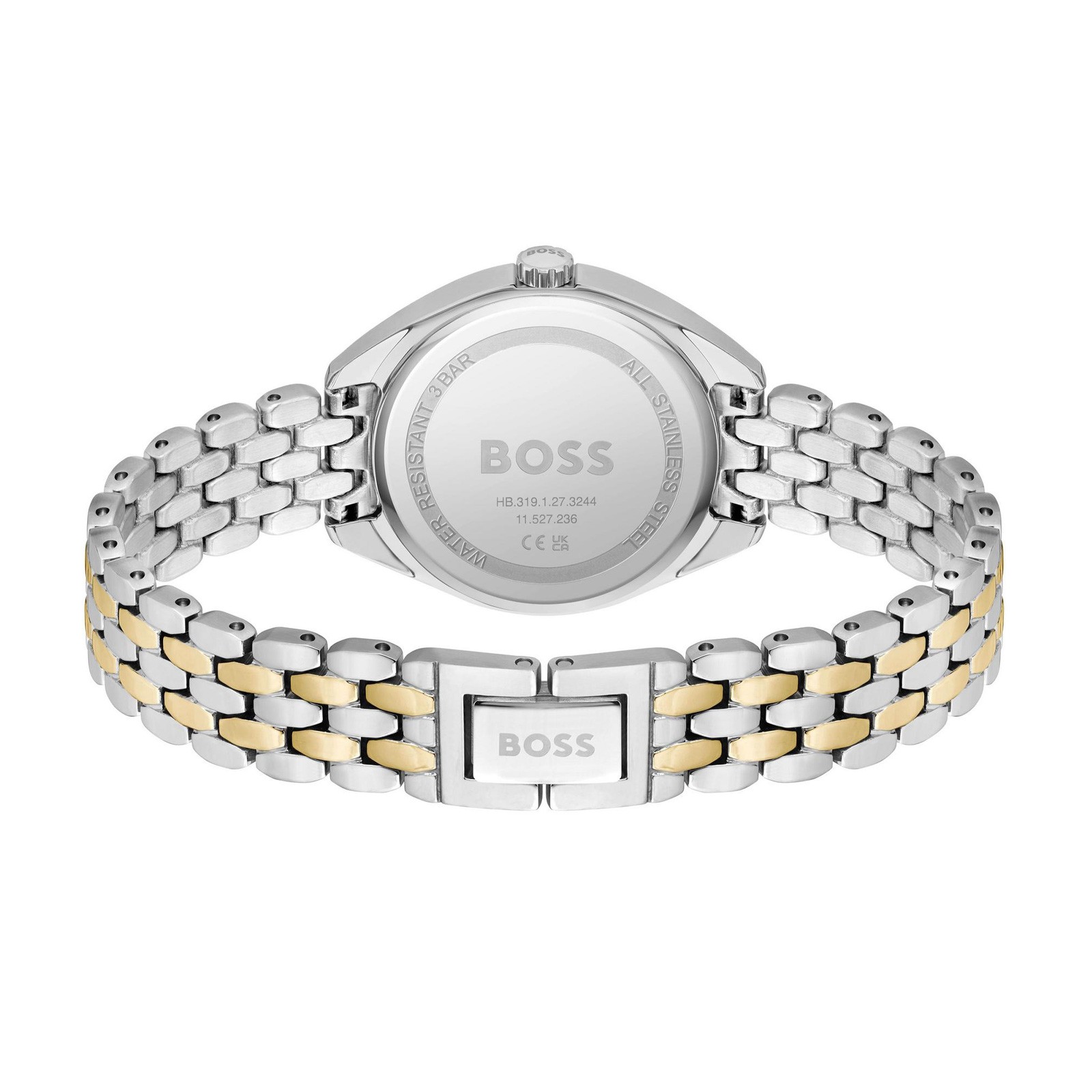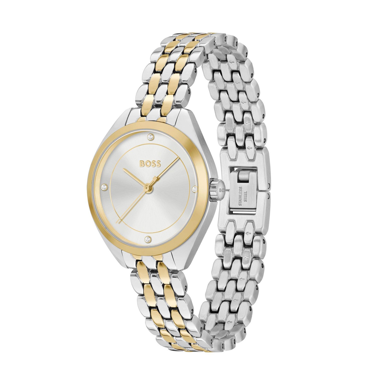BOSS Watches are immaculately tailored to lifestyles where style navigates and precision counts. Sharp cuts, clean designs and quality materials are always at the forefront. These distinctive timepieces, with their intrinsic air of elegant sophistication, create beautiful bridges connecting classic, modern and sporty. Introducing the Brand-New HUGO BOSS Ladies Watch 1502724, part of the Mae collection. Featuring a 30mm stainless steel and yellow gold two-toned case, and a silver white dial with four crystal-set indices. The hour, minute and second hands are gold to complement the design. Powered by precise and reliable quartz movements, water resistant up to 30 metres and features mineral glass to protect the dial.