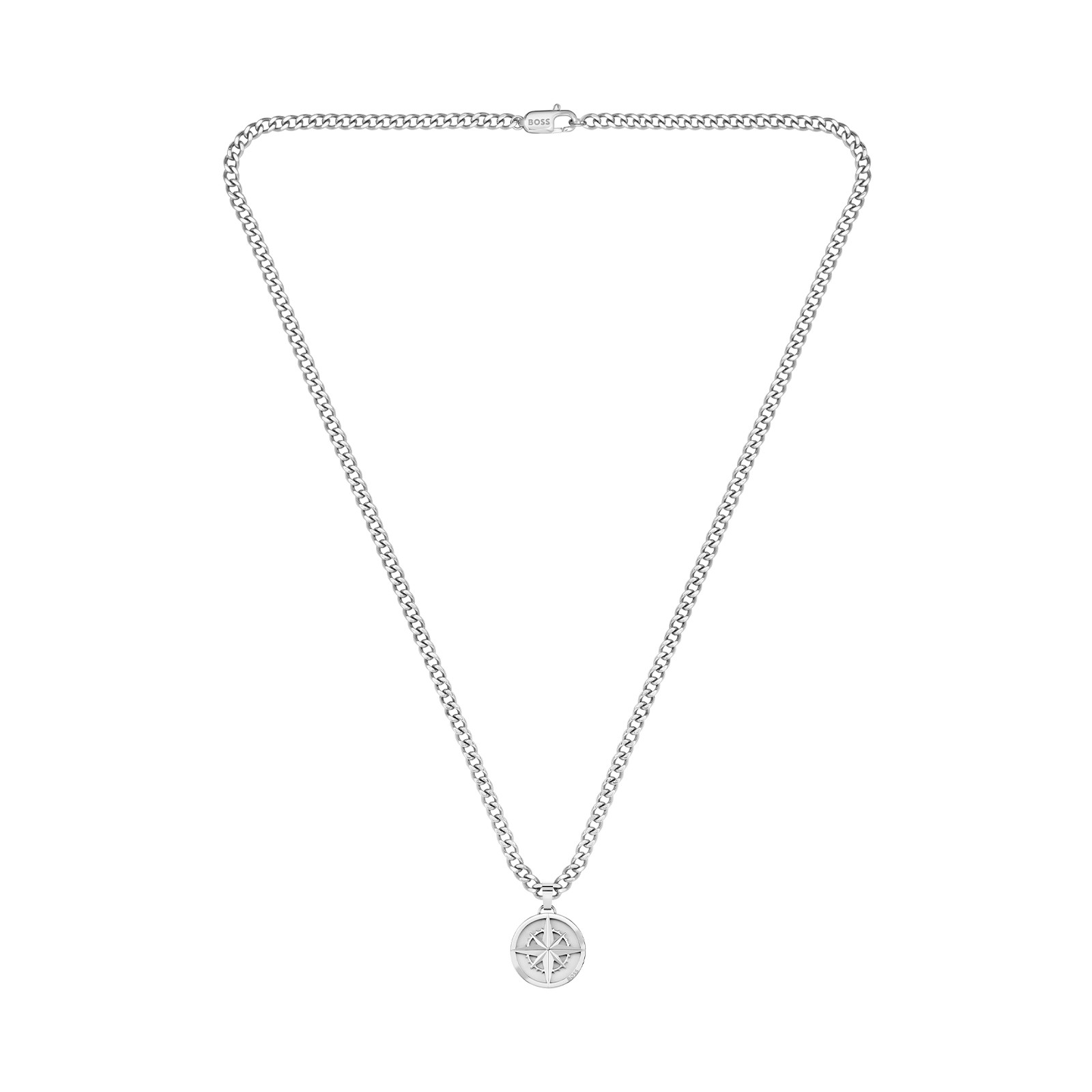 Elevate your jewellery collection with this Hugo Boss North Necklace 1580544, featuring a compass style pendant for a statement look. Crafted in stainless steel with a 20mm x 4.5mm pendant, this bold design will showcase your designer aesthetic. Presented on a 58cm chain and securely fastened with a BOSS branded lobster clasp.
