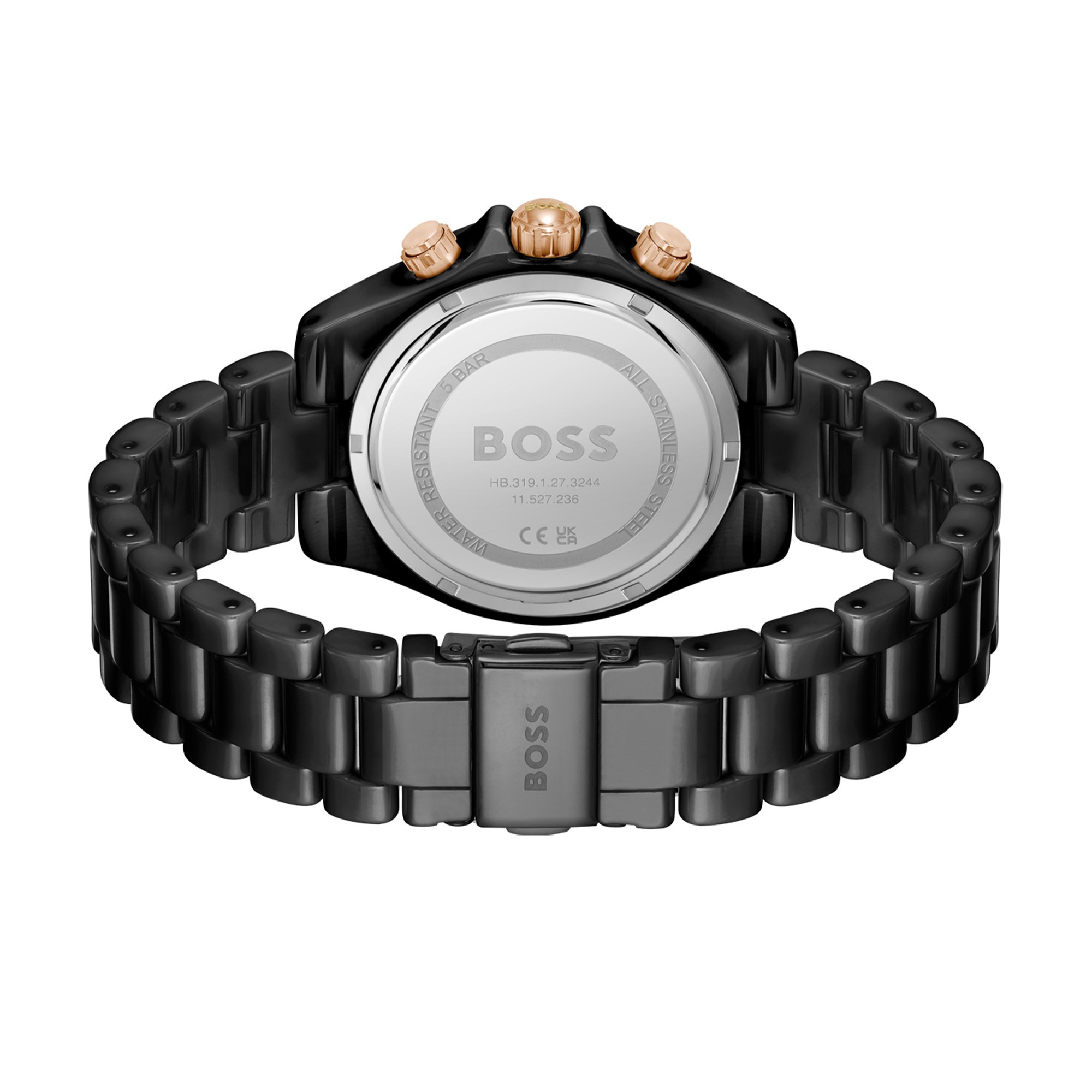 Sporty and chic, the BOSS Novia is a boyfriend-style watch that reflects the confidence and elegance of the BOSS woman. The multifunction timepiece with tachymeter includes sub-eyes with circular-brushed applied rings on the sunray dial, and secures with a polished link bracelet. Baguette crystals at 3, 6 and 9 on two of the five colour options in the collection add extra sparkle to the feminine design.