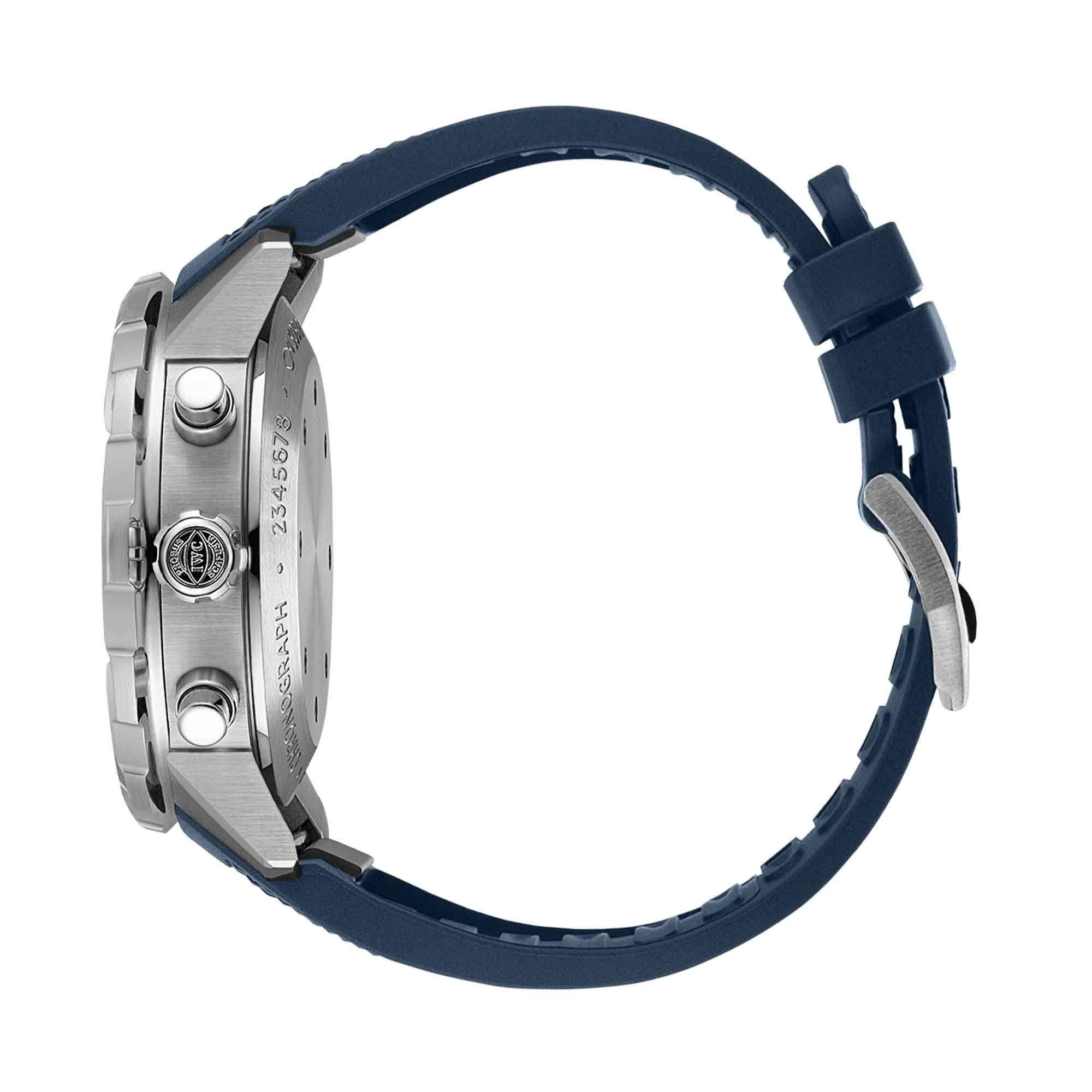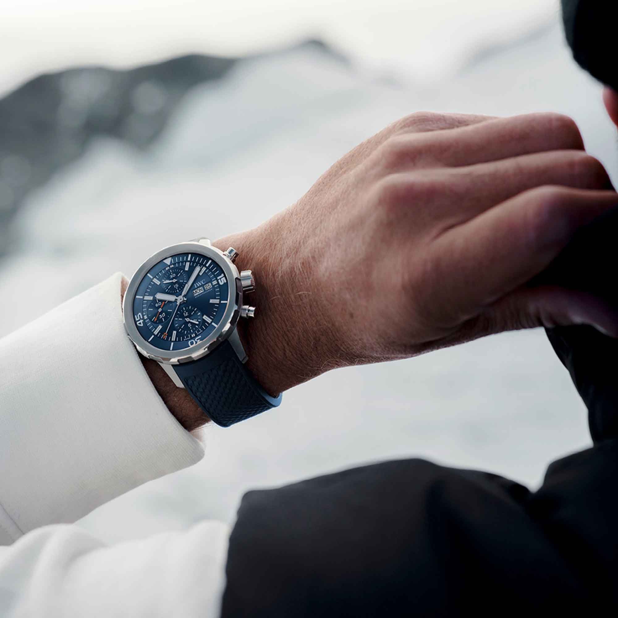 A robust construction, high pressure resistance, easy readability, and innovative technical functionality: these are the key features of the Aquatimer dive watches IWC has been engineering since 1967 and that are used by both professional and recreational scuba divers. The Aquatimer Chronograph is water-resistant to 30 bar and features a 44-millimeter case made of corrosion-resistant stainless steel. The diving-relevant indications on the blue dial are coated with luminous material to ensure optimum legibility under water. The external/internal rotating bezel combines ease of use with safety. The rotation of the external bezel is transmitted via a sliding clutch system to the internal bezel. The SafeDive system ensures that the inner ring with the dive time scale always rotates counterclockwise. Therefore, even in the event of an unintentional adjustment, the dive time can never be extended, and the diver's safety is guaranteed at all times. Thanks to the IWC quick-change system, the blue rubber strap can be exchanged for another bracelet effortlessly. Protected by convex sapphire glass with antireflective coating on both sides, a frequency of 28800.0 vph (4.0 hz), 44 hours power reserve and 25 Jewels, this watch comes with IWC presentation packaging and 2 year IWC warranty.